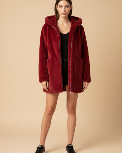 Μπορντώ γούνα με τσέπες και κουκούλα