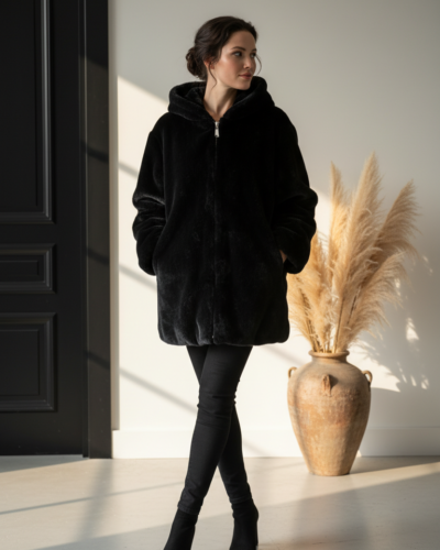 Μαύρη γούνα με τσέπες και κουκούλα