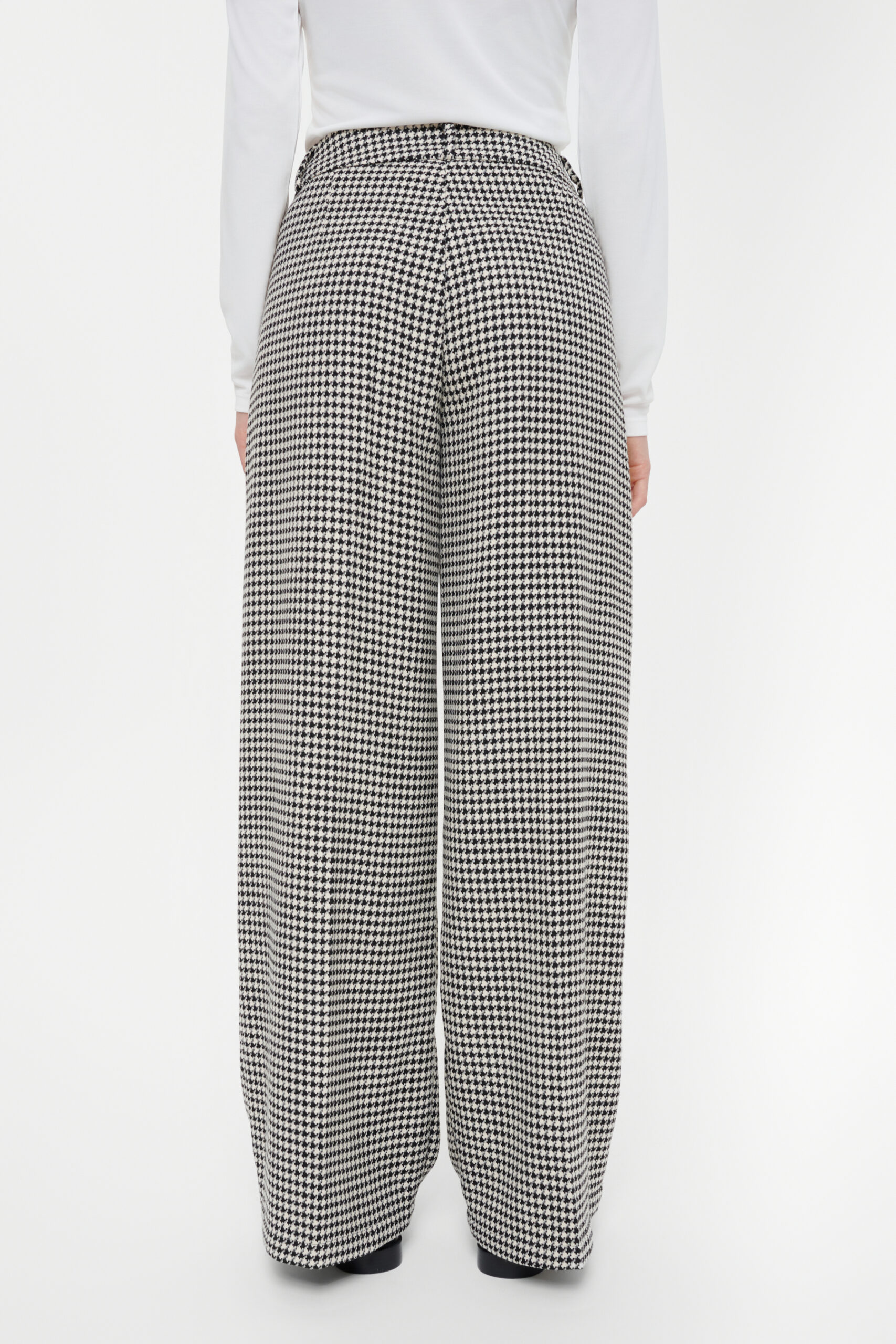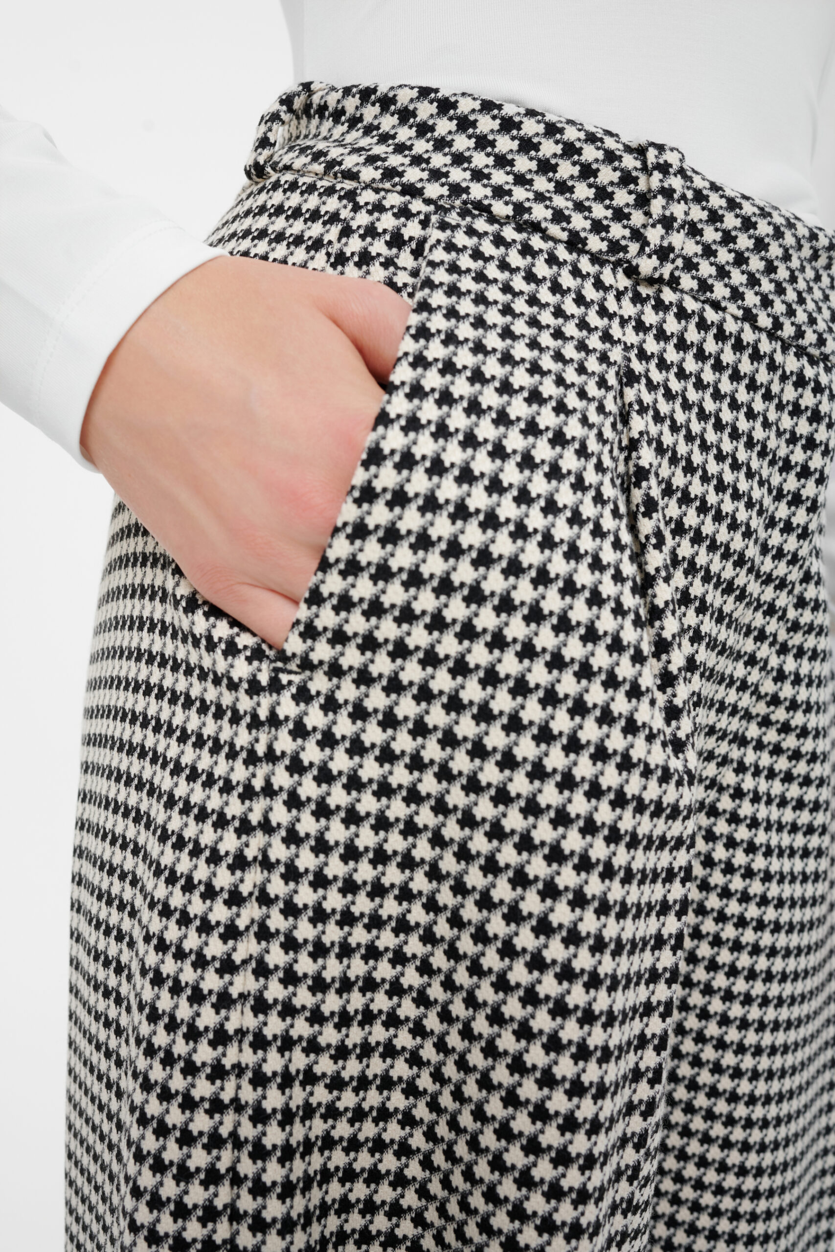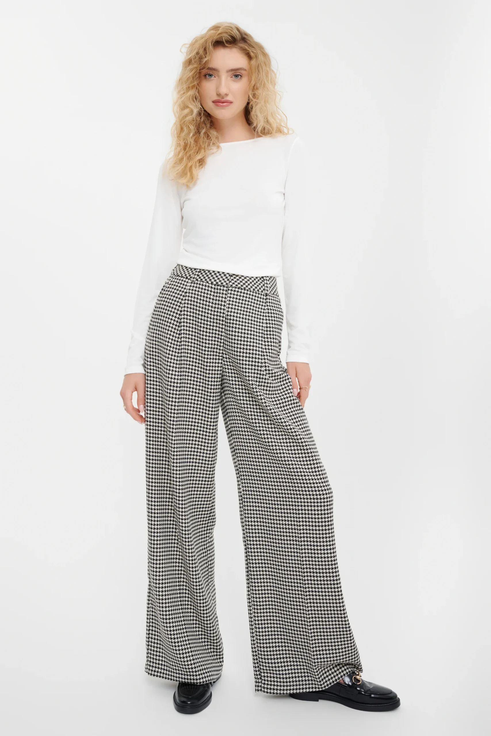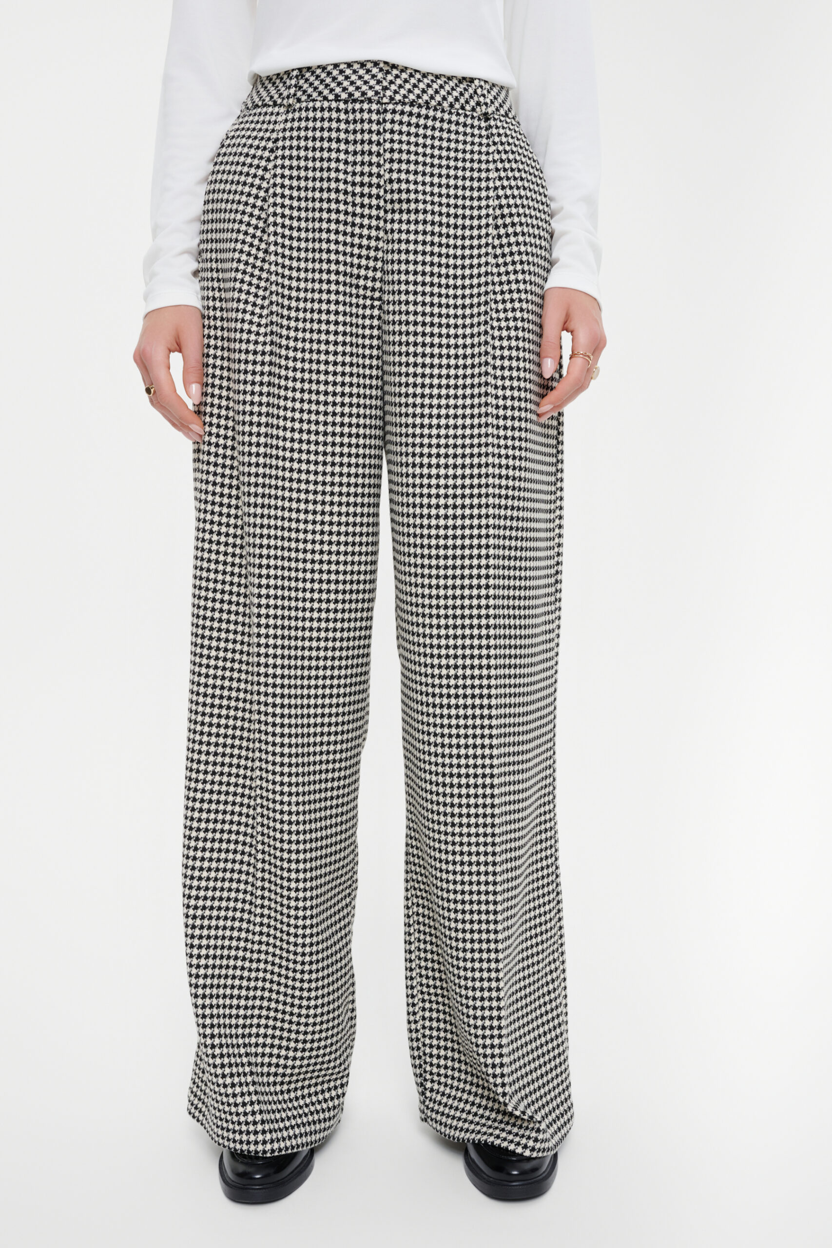 Επιλέξτε ένα statement κομμάτι με αυτό το παντελόνι pied de poule, που συνδυάζει την κομψότητα με το διαχρονικό μοτίβο. Το pied de poule σχέδιο σε ασπρόμαυρη παλέτα προσδίδει σοφιστικέ ύφος, ιδανικό για κάθε στιγμή της ημέρας.