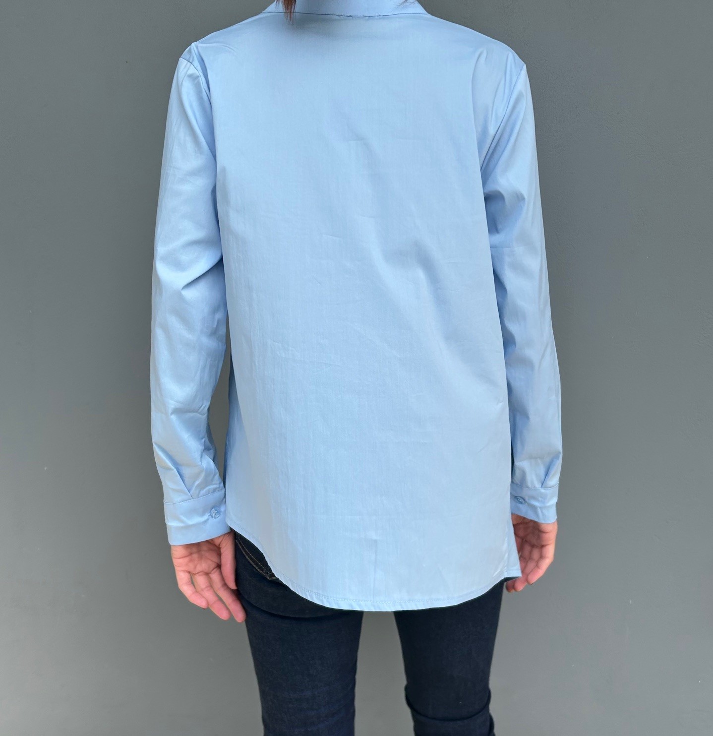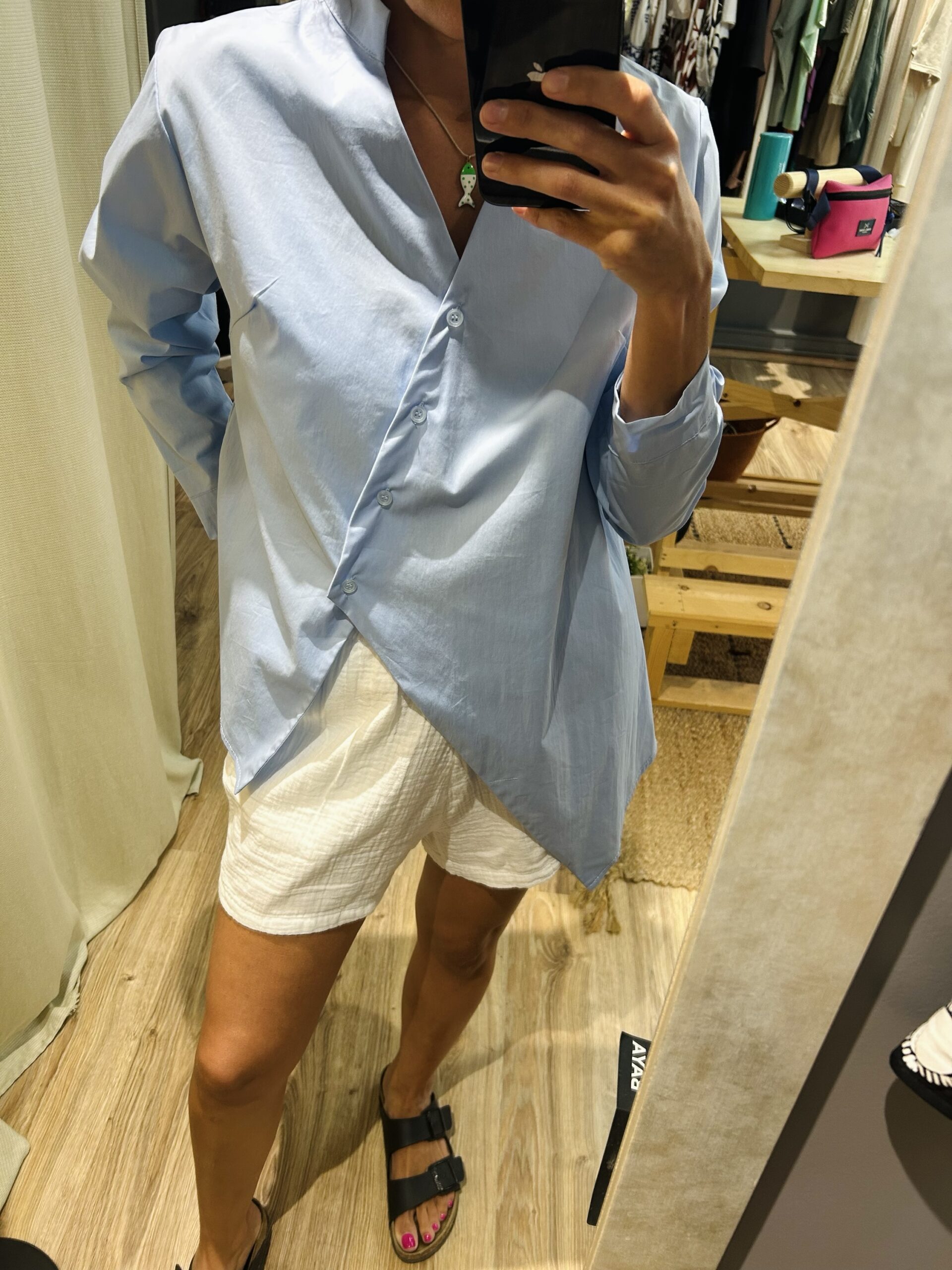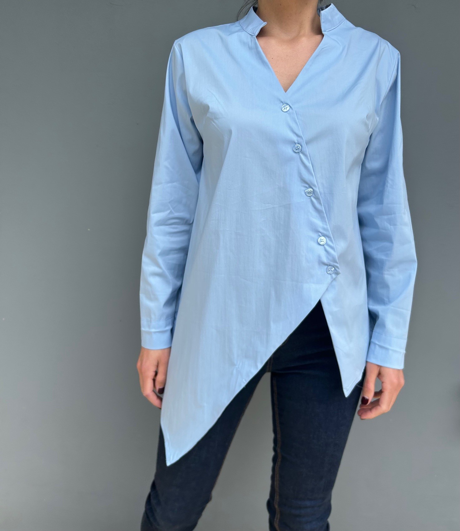 Αυτό το ασύμμετρο, βαμβακερό πουκάμισο σε μπλε χρώμα ξεχωρίζει για τον μοναδικό σχεδιασμό του και την κομψή του γραμμή. Κατασκευασμένο από βαμβάκι, προσφέρει άνεση καθ’ όλη τη διάρκεια της ημέρας. Το πιο εντυπωσιακό στοιχείο του είναι ο ιδιαίτερος τρόπος που κουμπώνει μπροστά, προσφέροντας μια ξεχωριστή και μοντέρνα πινελιά στο συνολικό του στυλ.
