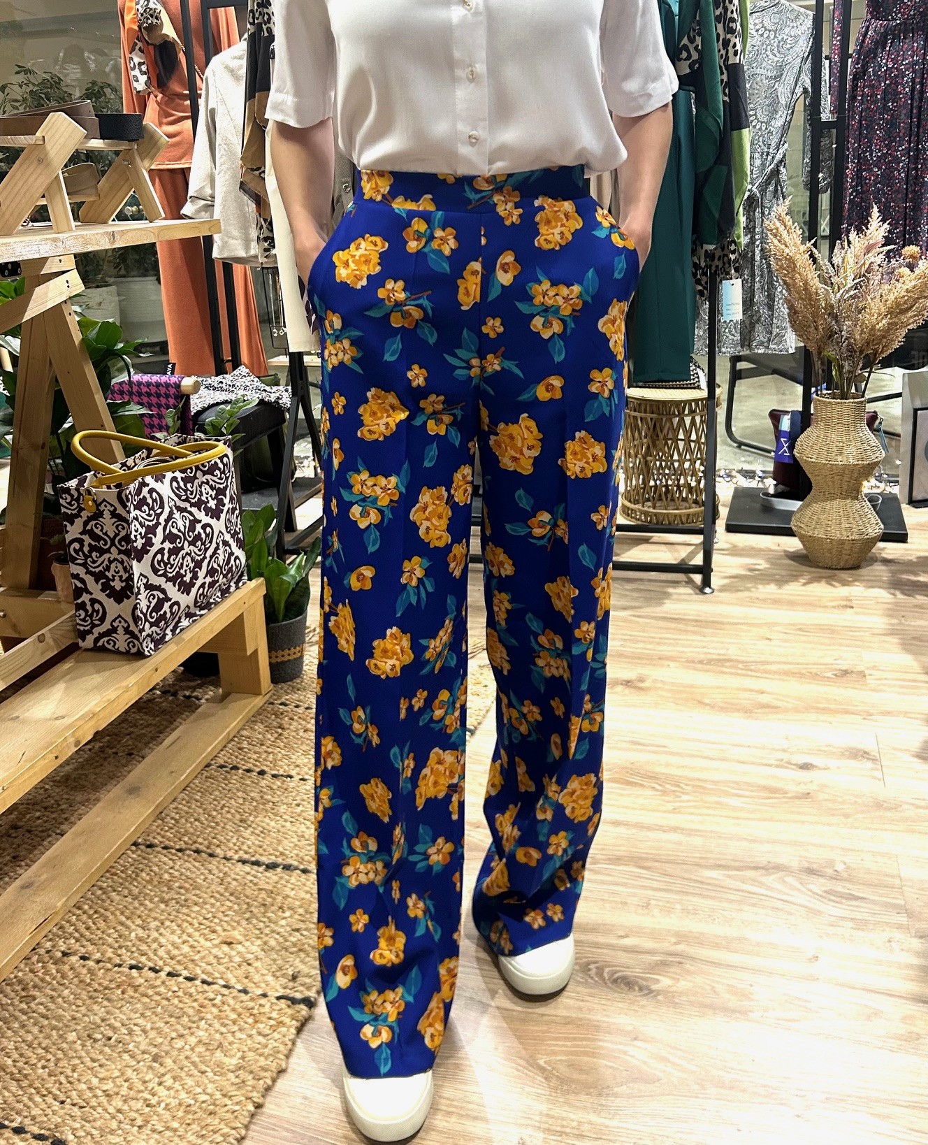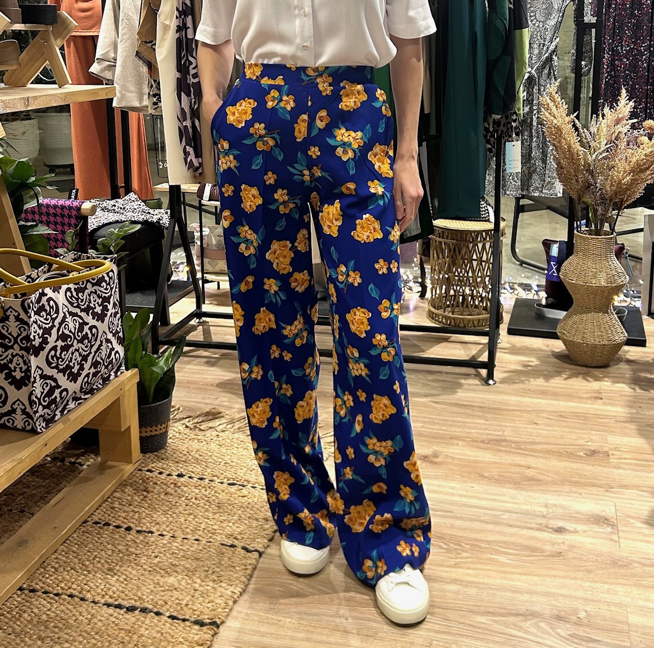 Ανακαλύψτε την ψηλόμεση floral παντελόνα σε μπλε απόχρωση, που συνδυάζει έντονα χρώματα και μοντέρνα στυλ με απόλυτη άνεση.