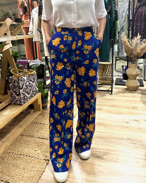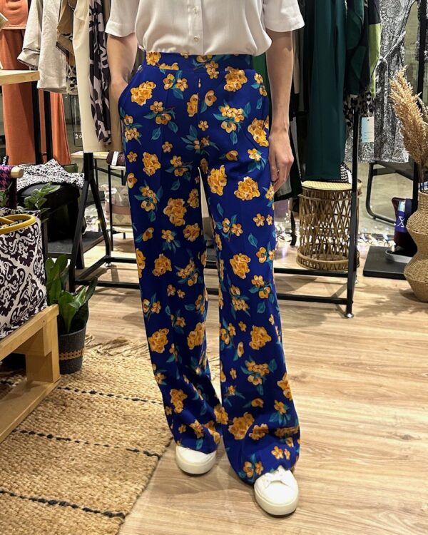 Ανακαλύψτε την ψηλόμεση floral παντελόνα σε μπλε απόχρωση, που συνδυάζει έντονα χρώματα και μοντέρνα στυλ με απόλυτη άνεση.