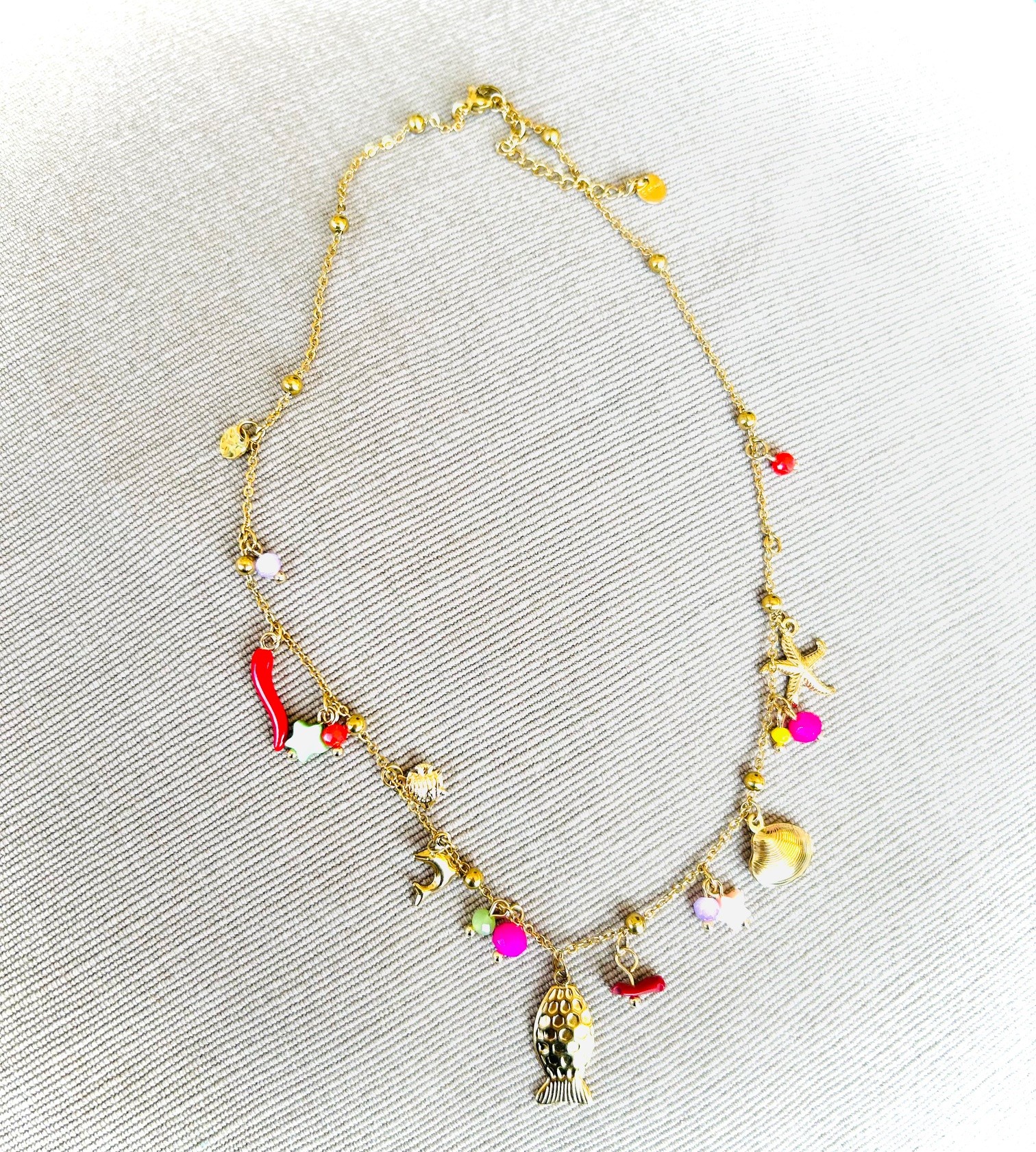 Αναδείξτε το στυλ σας με αυτό το κομψό και διαχρονικό ατσάλινο χρυσό κολιέ, διακοσμημένο με μοναδικά charms που προσθέτουν λάμψη και χαρακτήρα στην εμφάνισή σας.