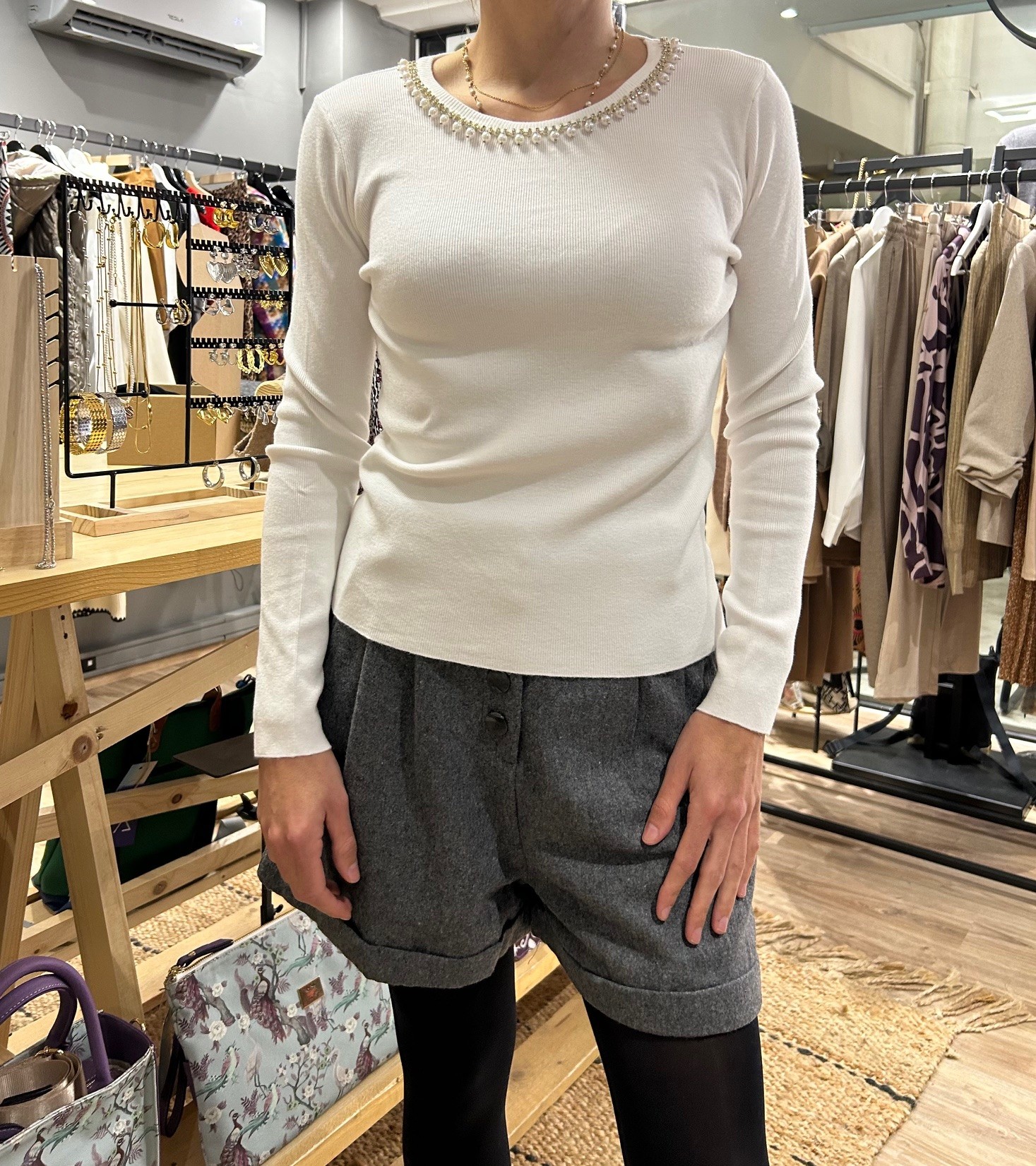 Αναδείξτε την κομψότητα με αυτή τη μακρυμάνικη μπλούζα από βισκόζη, εμπλουτισμένη με λαμπερά στρας στο λαιμό που χαρίζουν έναν αέρα πολυτέλειας σε κάθε σας εμφάνιση. Πρόκειται για ένα διαχρονικό και ευέλικτο κομμάτι που συνδυάζει άνεση, στυλ και προσεγμένη λεπτομέρεια, ιδανικό για όλες τις ώρες της ημέρας.