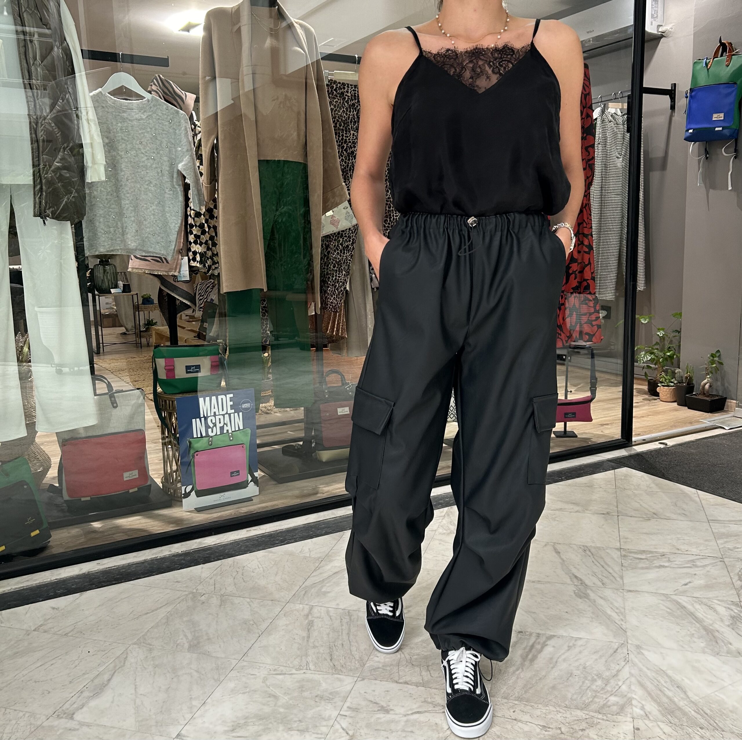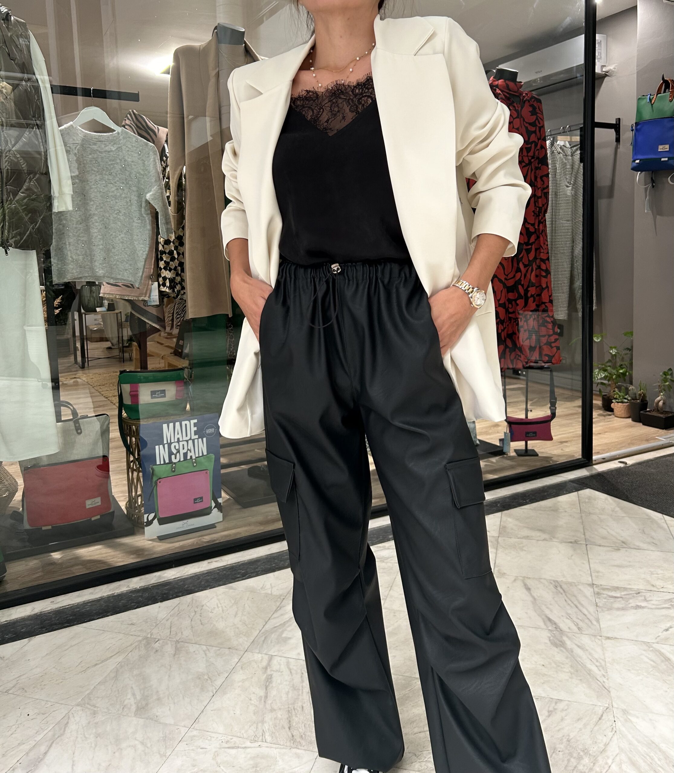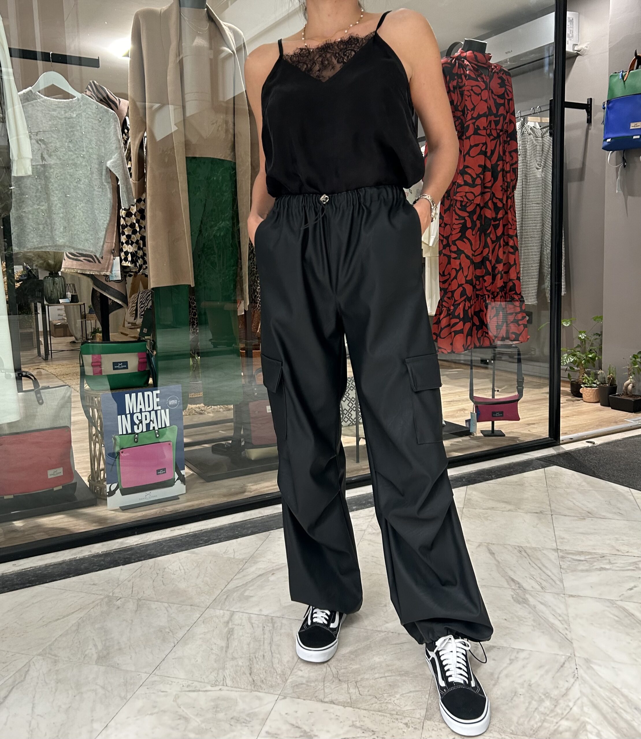 Cargo παντελόνι από δερματίνη για μια τολμηρή και μοντέρνα εμφάνιση. Με χαρακτηριστικές μεγάλες τσέπες στα πλαϊνά, προσφέρει τόσο πρακτικότητα όσο και στυλ, ενώ η υφή της δερματίνης χαρίζει μια κομψή αίσθηση.