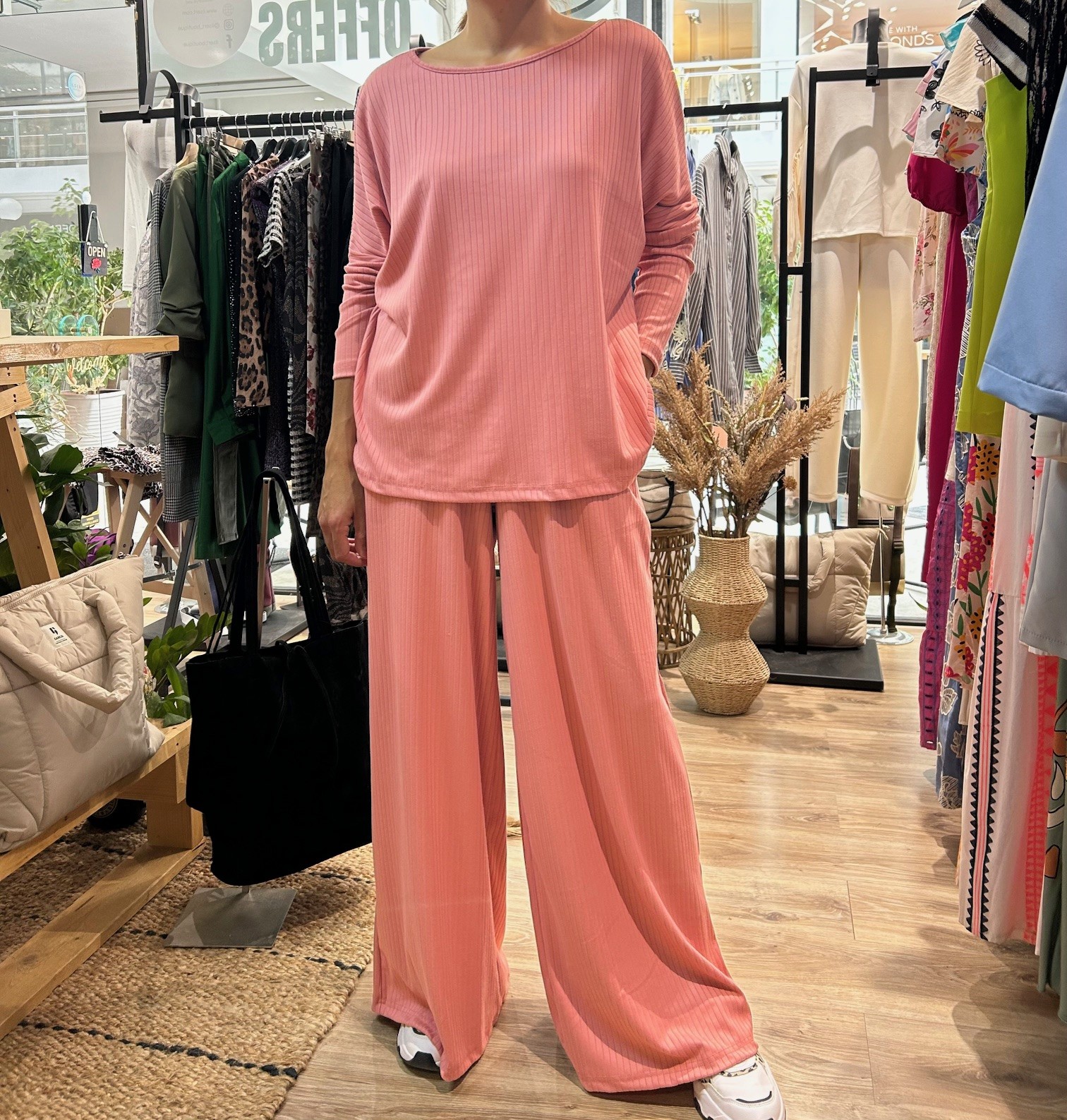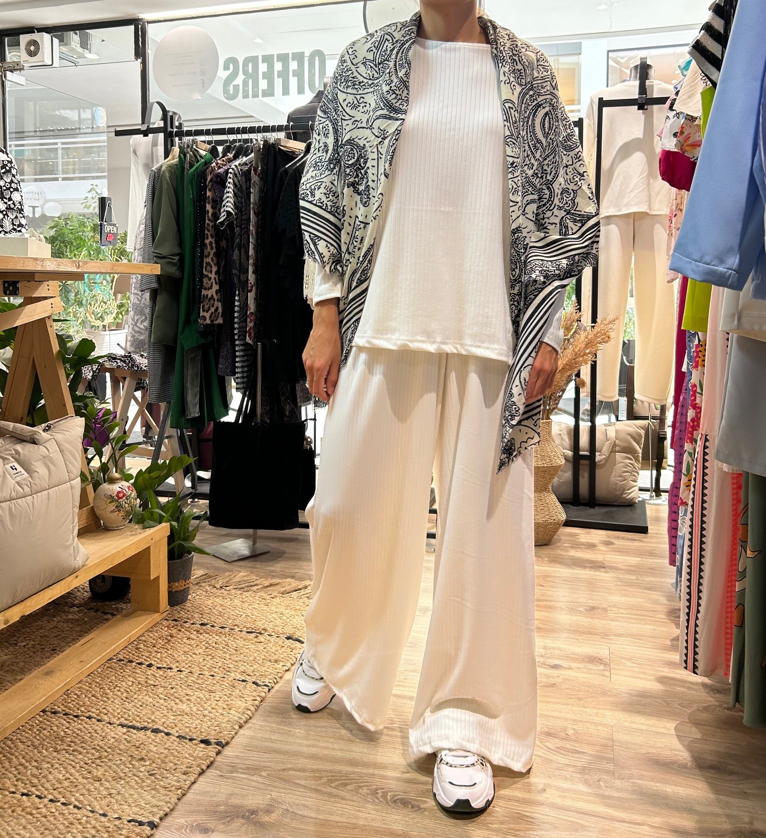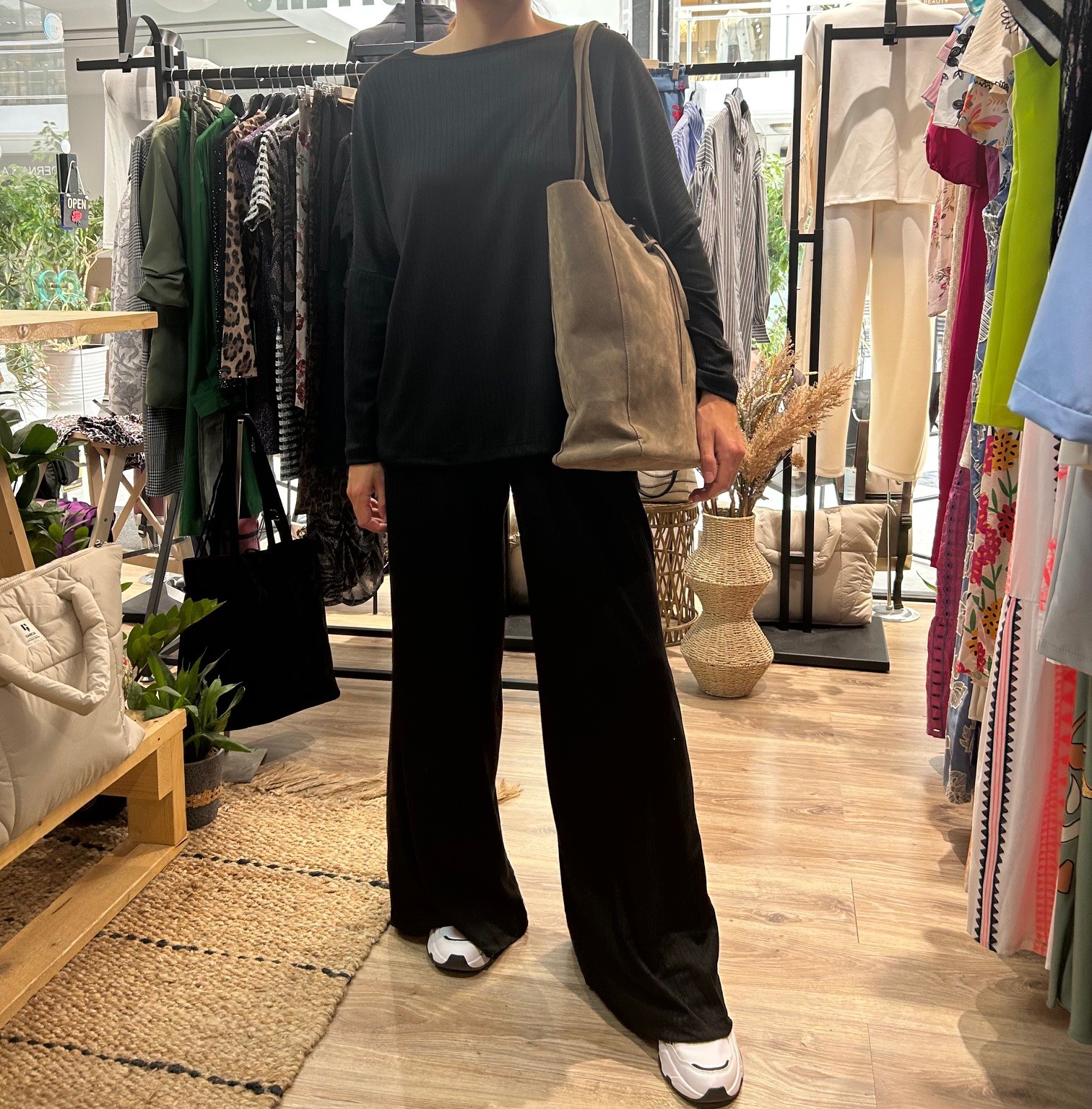 Η ψηλόμεση παντελόνα έχει λάστιχο στη μέση, και η μπλούζα έχει άνετη και μοντέρνα γραμμή. Ένα outfit που μπορείς να φορέσεις από το πρωί μέχρι το βράδυ, απλά αλλάζοντας τα αξεσουάρ σου.