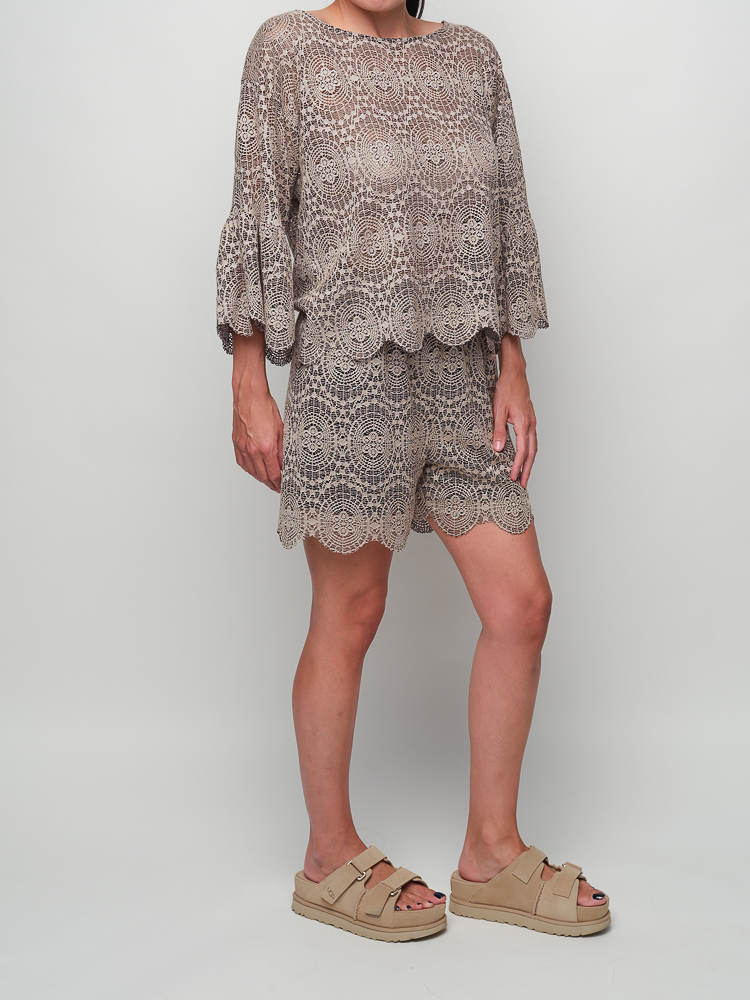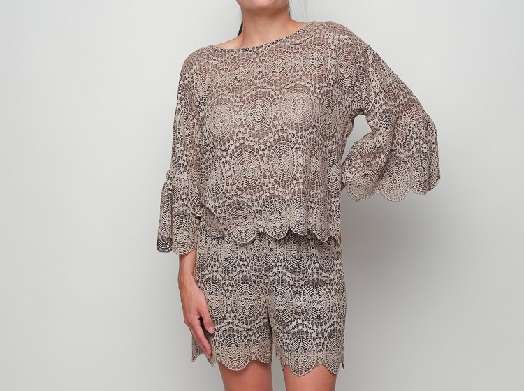 Ιδιαίτερη και ευκολοφόρετη δαντελένια μπλούζα από τη Victoria Haitoglou με λεπτομέρειες στα μανίκια. Έχει άνετη γραμμή.
