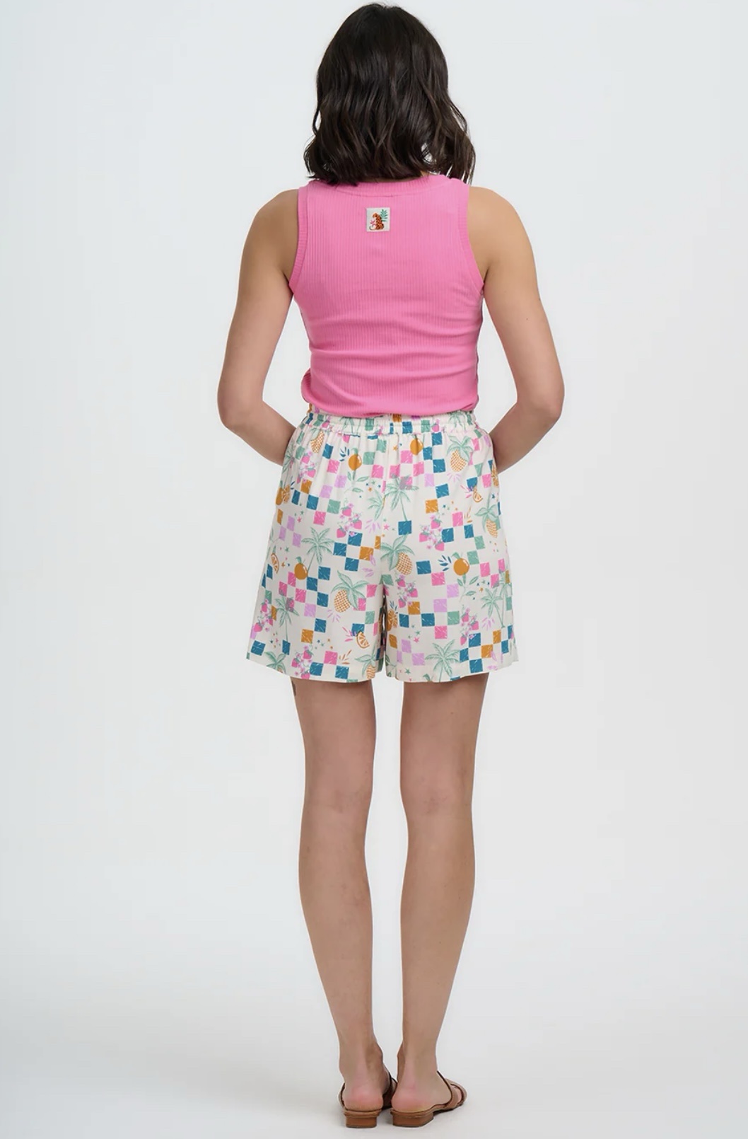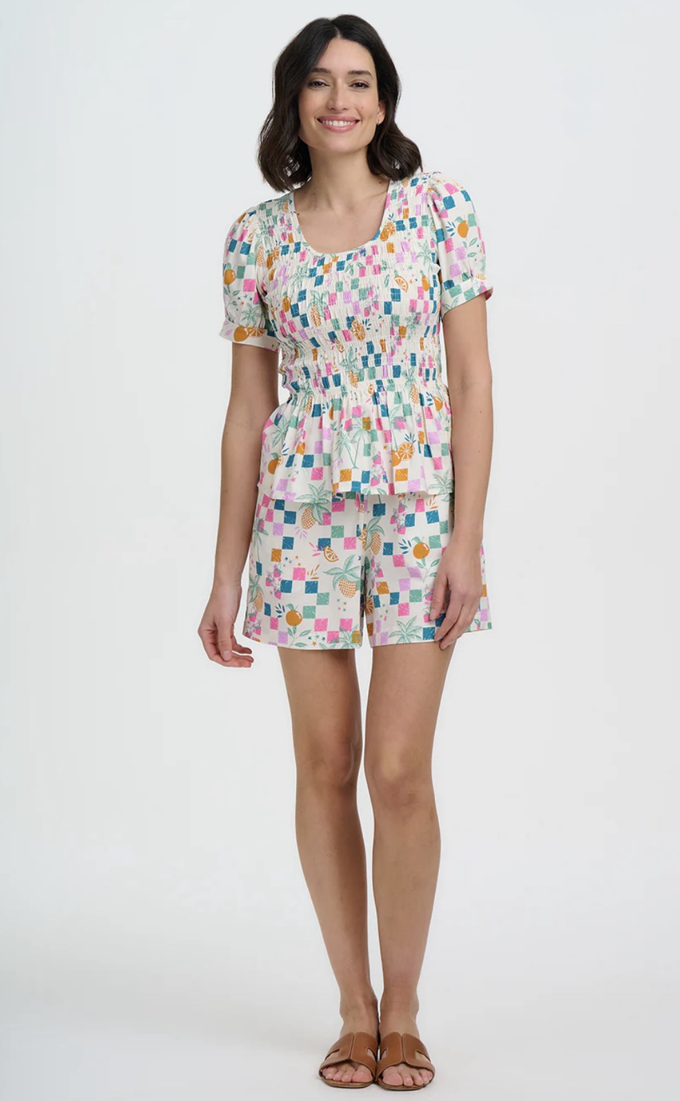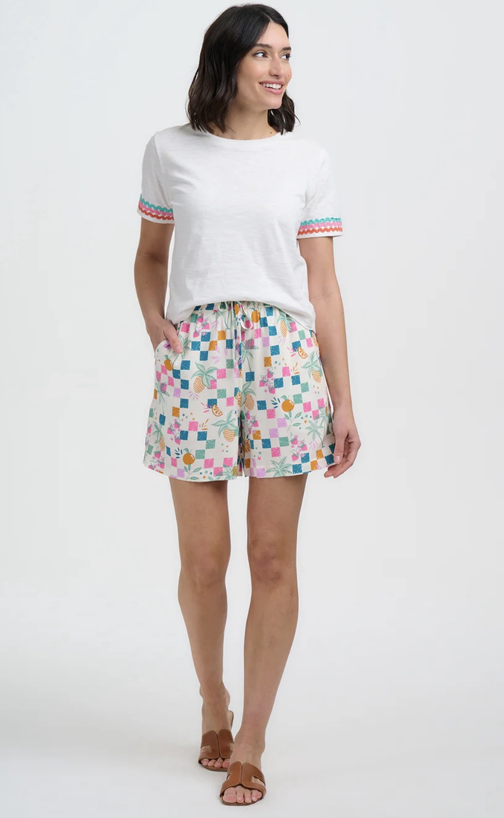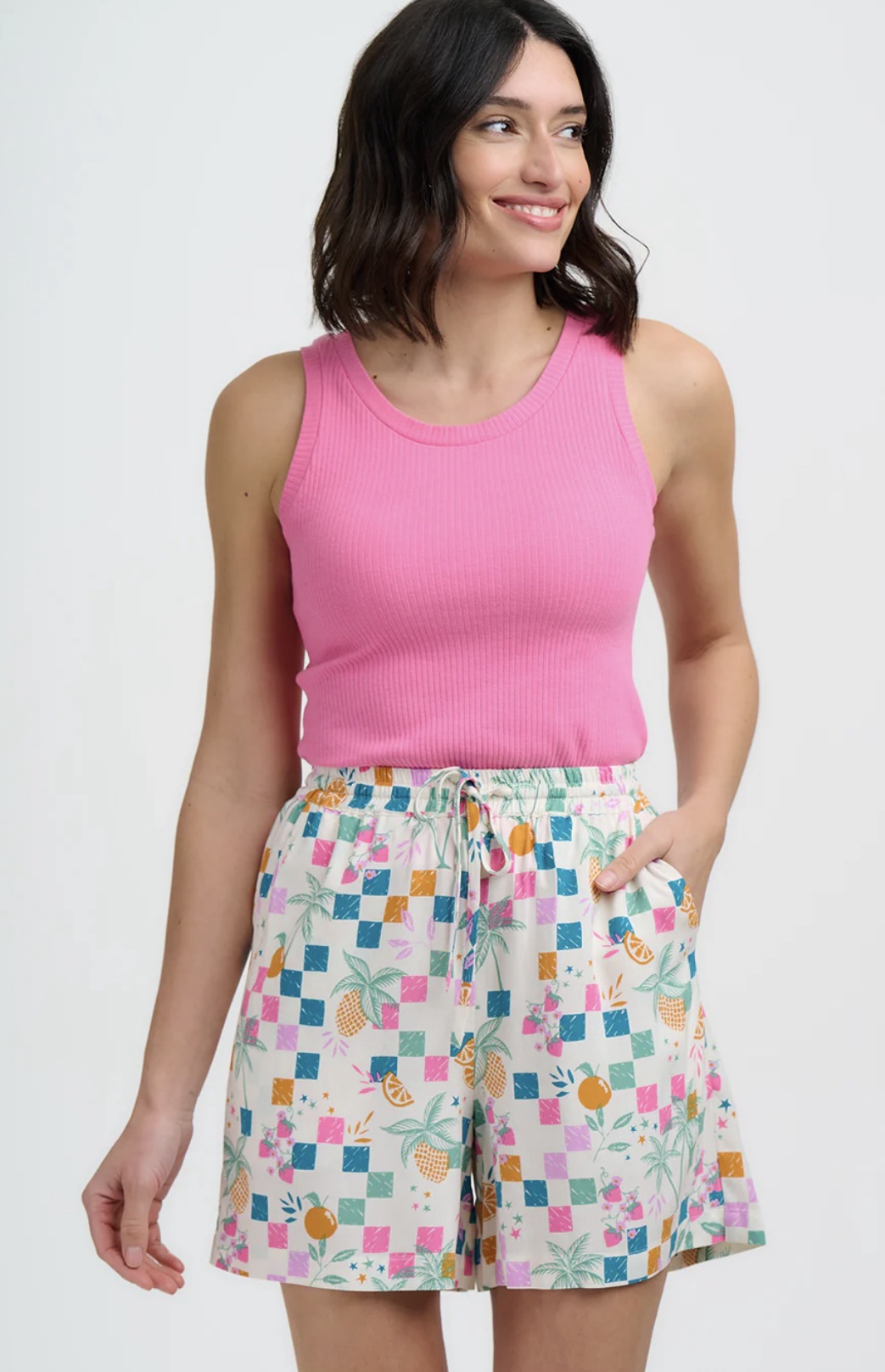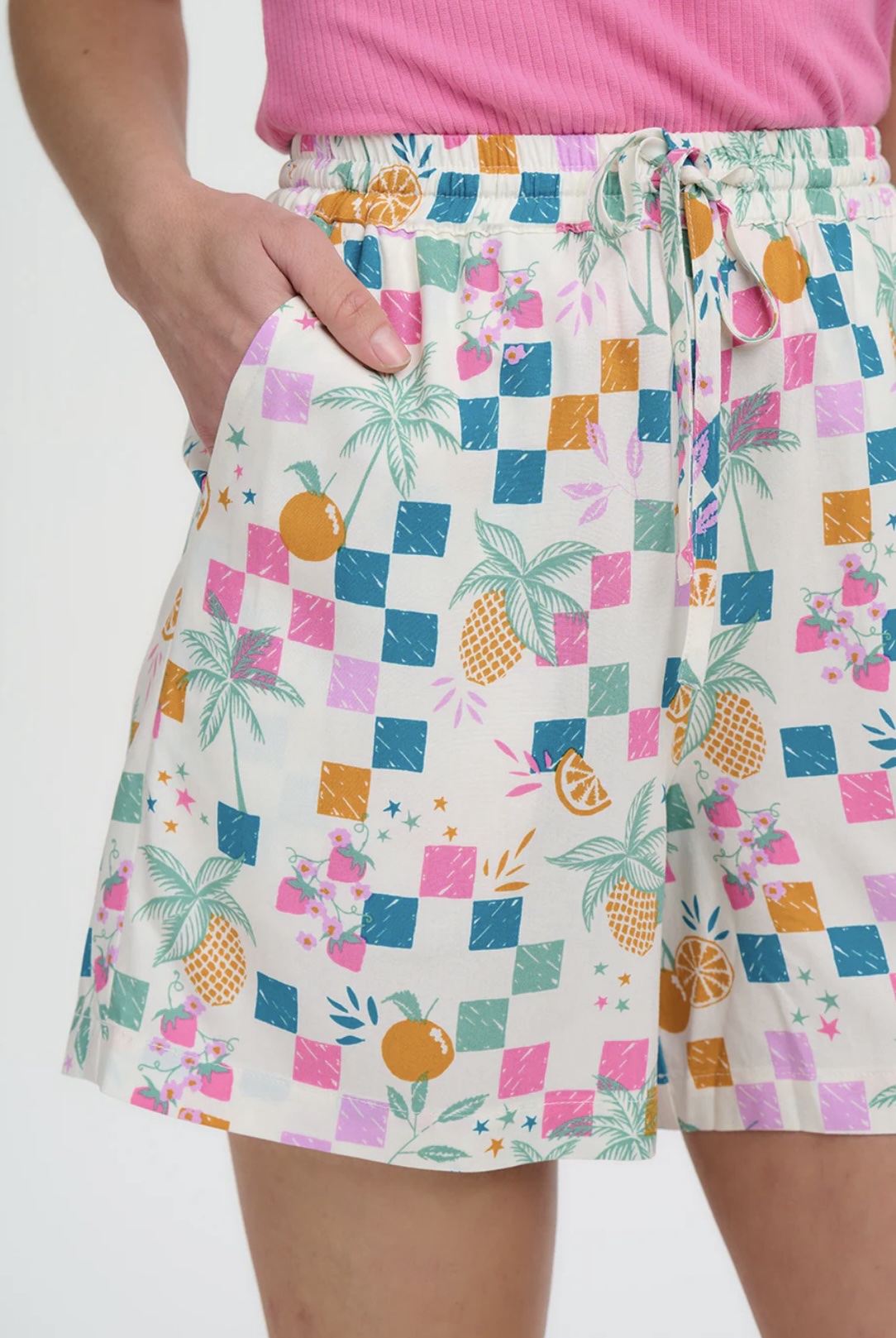 Μείνε δροσερή και στιλάτη όλο το καλοκαίρι με το Fruit Shorts. Σχεδιασμένο με ελαστική μέση και ρυθμιζόμενο ζωνάκι με κορδόνι, αυτό το σορτς συνδυάζει άνεση και ευελιξία. Διαθέτει ζωντανά τροπικά φρούτα, φοίνικες και παιχνιδιάρικους χαρακτήρες που απλώνονται σε πολύχρωμα καρό τετράγωνα πάνω σε ανοιχτόχρωμο φόντο, δημιουργώντας ένα χαρούμενο, γιορτινό μοτίβο- ο ιδανικός συνδυασμός casual άνεσης και εντυπωσιακού στυλ.