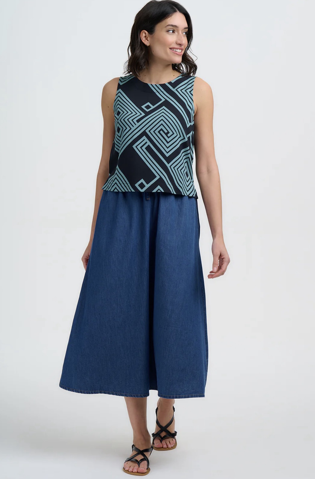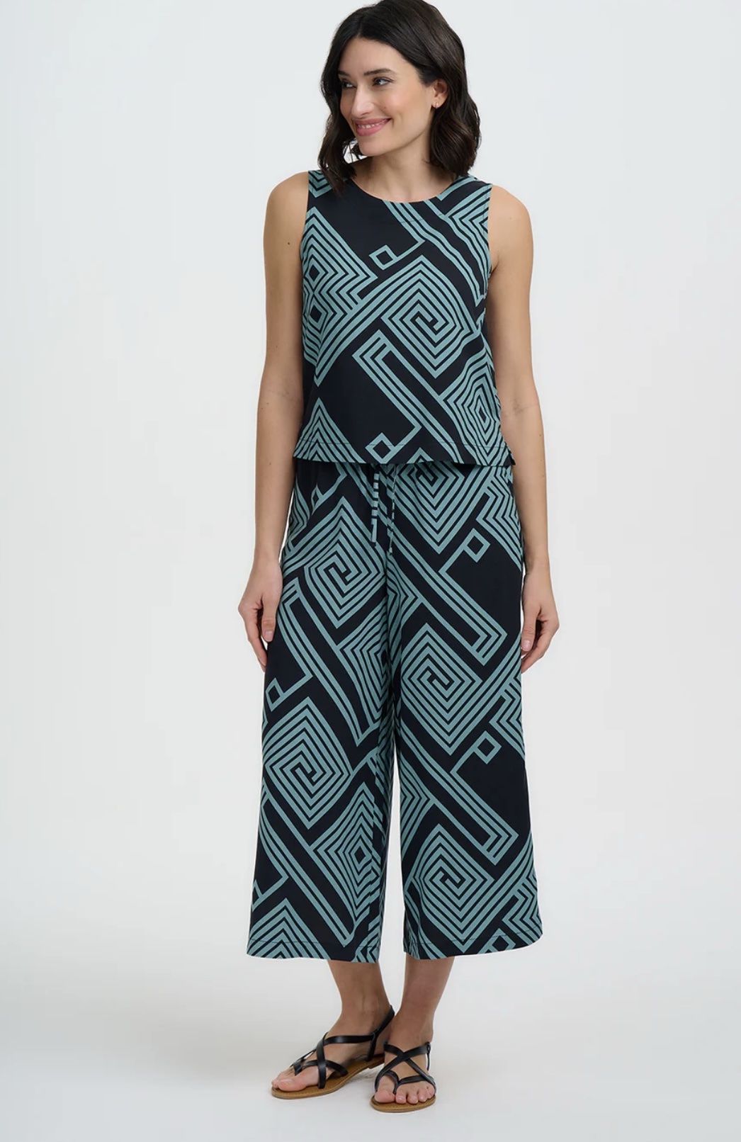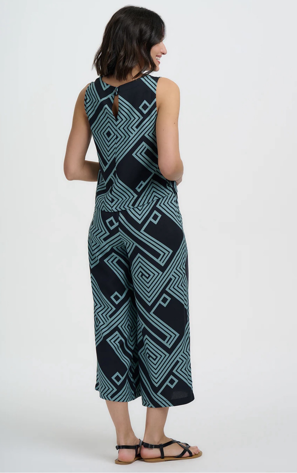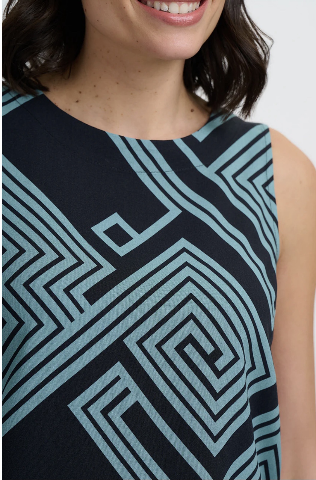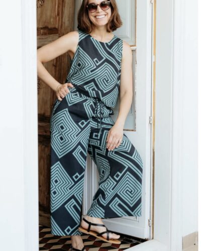 Το Geometric lines Top φέρνει δροσερό καλοκαιρινό αέρα με τη boxy, αμάνικη γραμμή του και την κλασική στρογγυλή λαιμόκοψη. Μια κομψή, γωνιακή λεπτομέρεια με άνοιγμα (keyhole) στο πίσω μέρος, που κλείνει με διακριτικό κουμπί-σούστα, προσθέτει μια στιλάτη πινελιά. Τα τιρκουάζ γεωμετρικά σπιράλ και οι ρόμβοι δημιουργούν ένα έντονο, λαβυρινθώδες μοτίβο πάνω σε μαύρο φόντο.