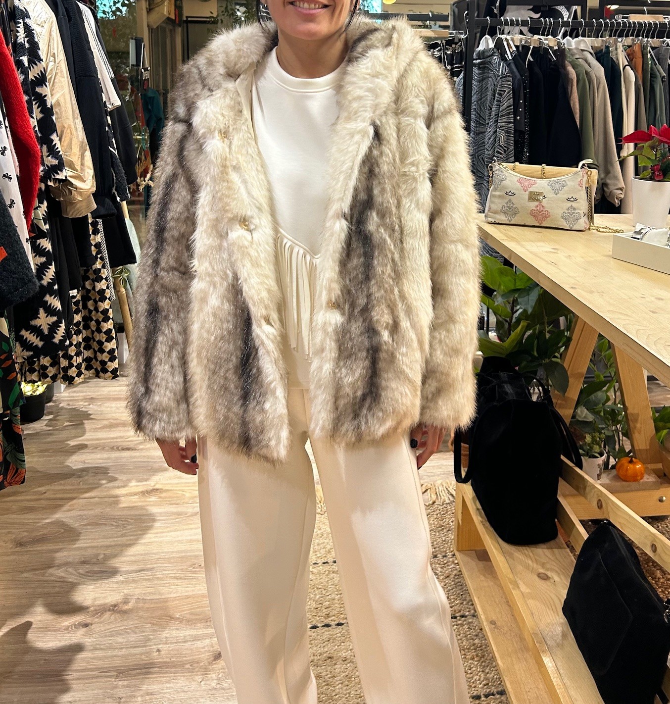 Γούνα εκρού με καφέ λεπτομέρειες και τσέπες
