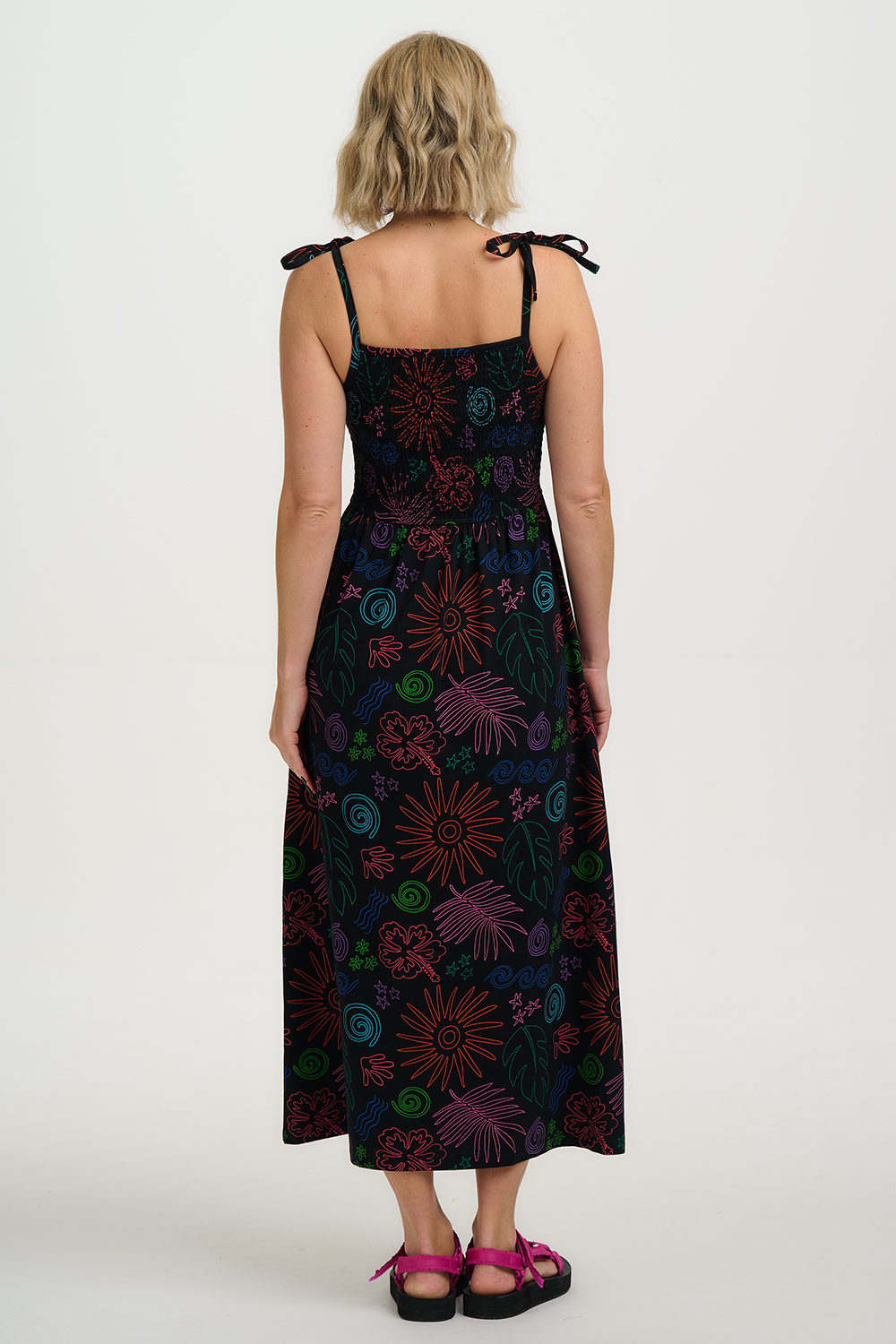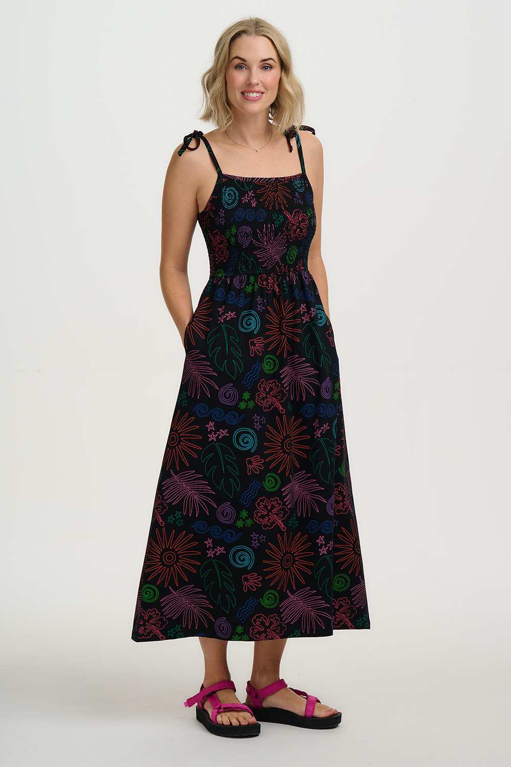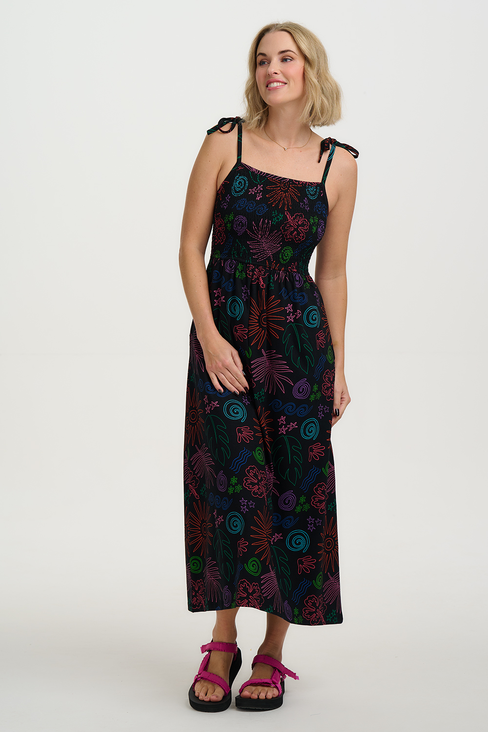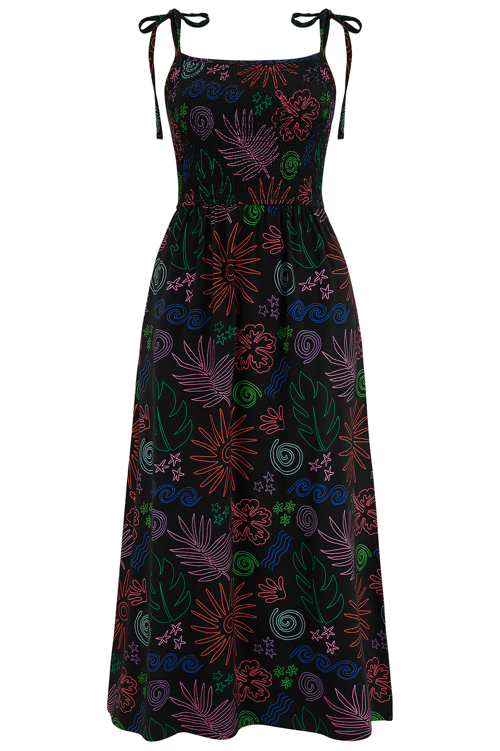 Πες γεια στο απόλυτο καλοκαιρνό island fiesta jersey midi dress! Σχεδιασμένο για ηλιόλουστες μέρες και εύκολη χρήση, αυτό το κολακευτικό φόρεμα διαθέτει ρυθμιζόμενες τιράντες που δένουν στους ώμους, άνετο μπούστο και αέρινη φούστα που πέφτει κομψά κάτω από το γόνατο. Τα πολύχρωμα τροπικά line-art σχέδια- φοίνικες, ήλιοι, λουλούδια και κύματα, ξεχωρίζουν πάνω σε μαύρη βάση, δημιουργώντας ένα ζωντανό και παιχνιδιάρικο μοτίβο. Το νέο σου αγαπημένο καλοκαιρινό φόρεμα έφτασε!