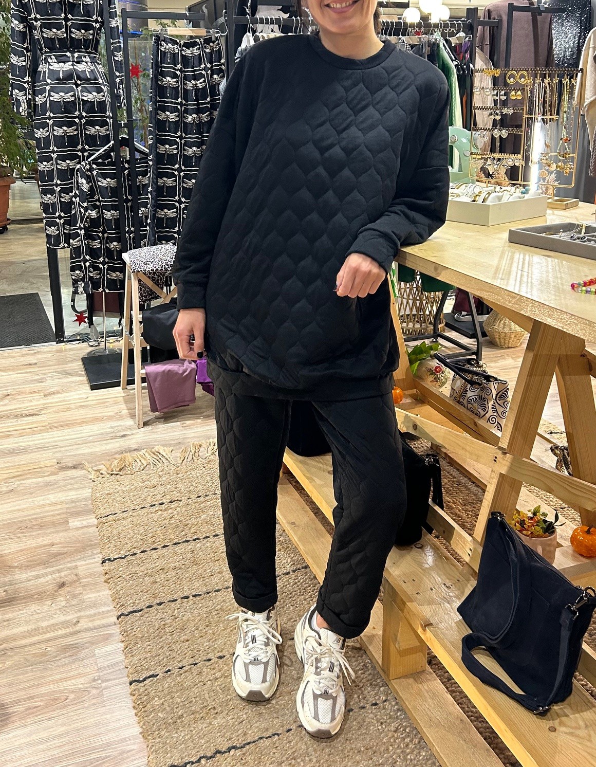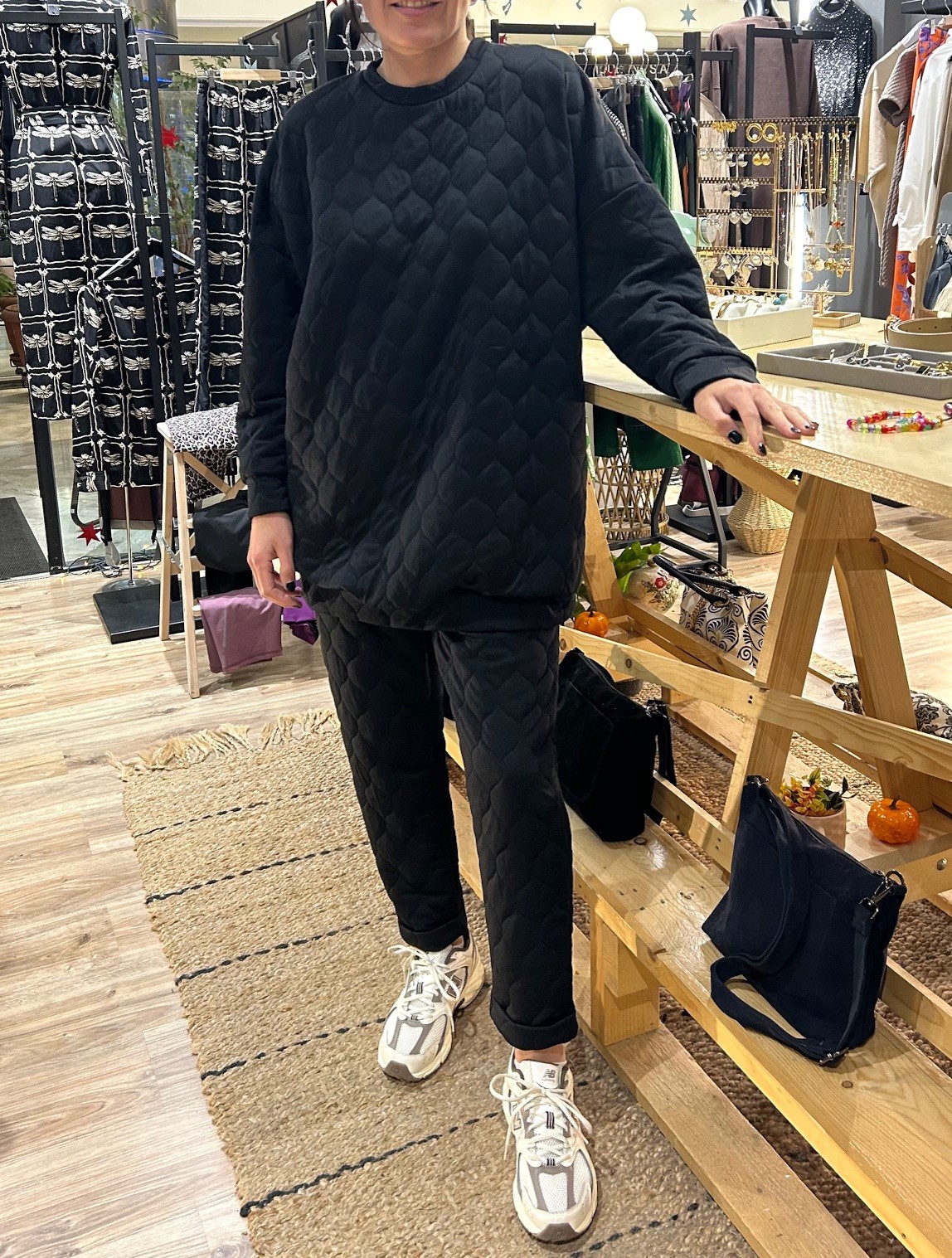 Μοντέρνο και άνετο καπιτονέ σετ σε μαύρη απόχρωση, αποτελούμενο από oversized μπλούζα και φόρμα παντελόνι. Προσφέρει απόλυτη άνεση, ενώ το καπιτονέ ύφασμα το καθιστά ιδιαίτερο! Ιδανική επιλογή για casual εμφανίσεις.