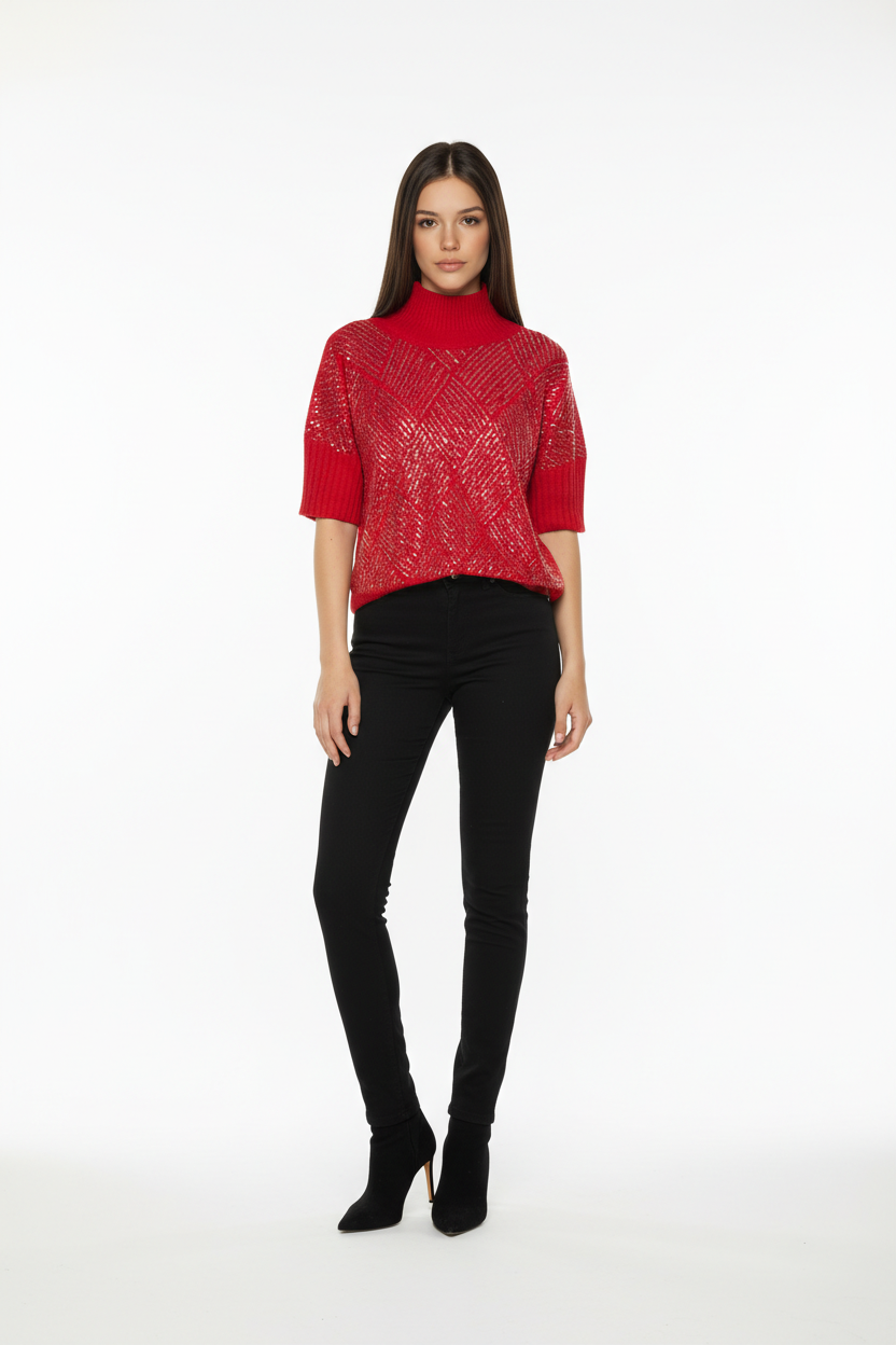 Λαμπερή, κόκκινη μπλούζα παγιέτες, ιδανική για εντυπωσιακές εμφανίσεις. Συνδυάζει άνετη εφαρμογή με έντονο στυλ και αποτελεί την τέλεια επιλογή για βραδινές εξόδους και ιδιαίτερες περιστάσεις.