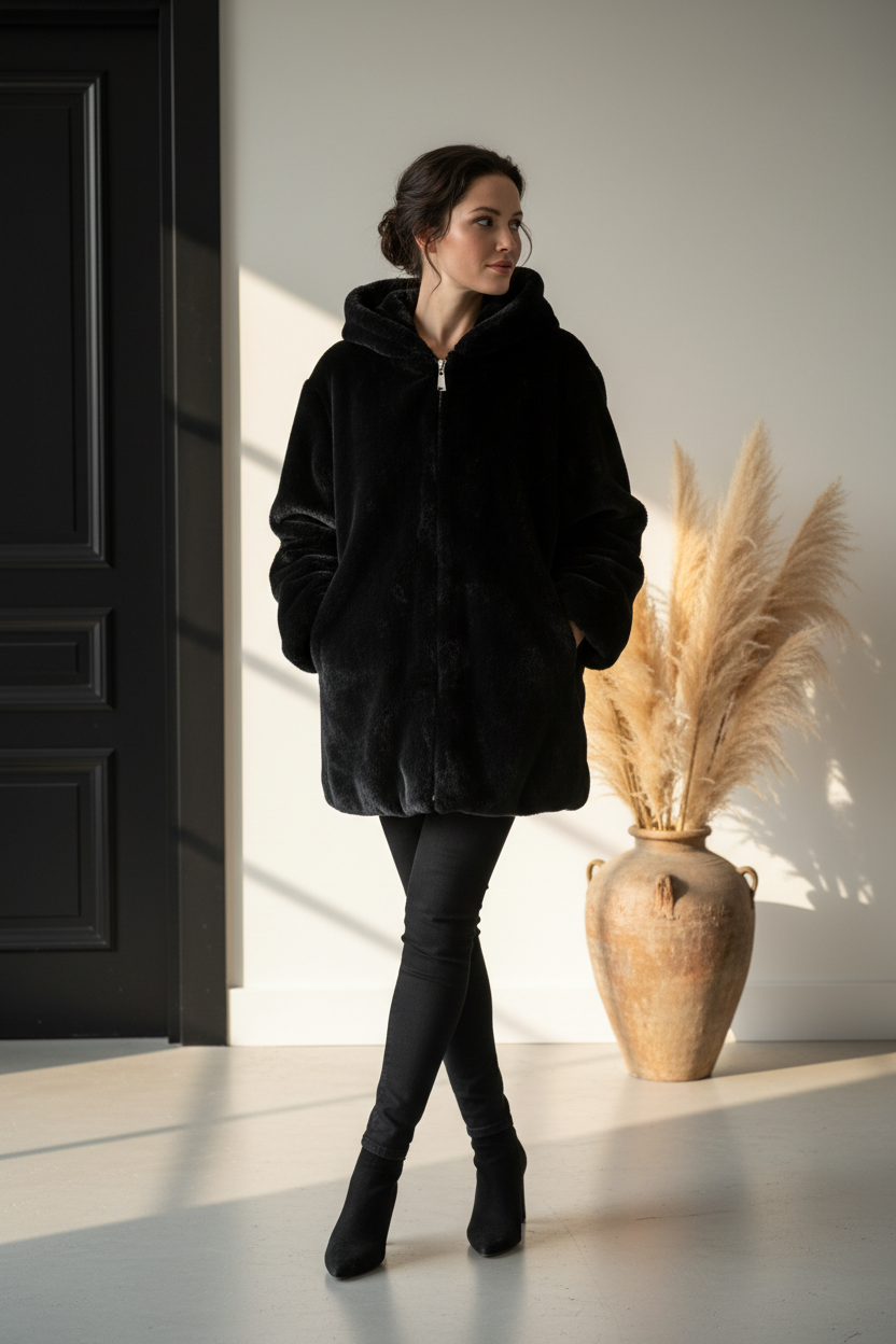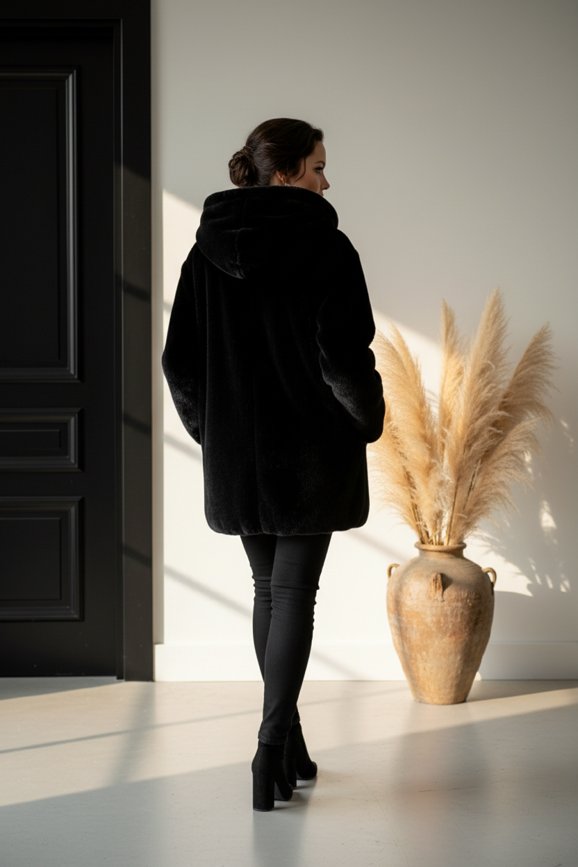 Μαύρη γούνα με τσέπες και κουκούλα