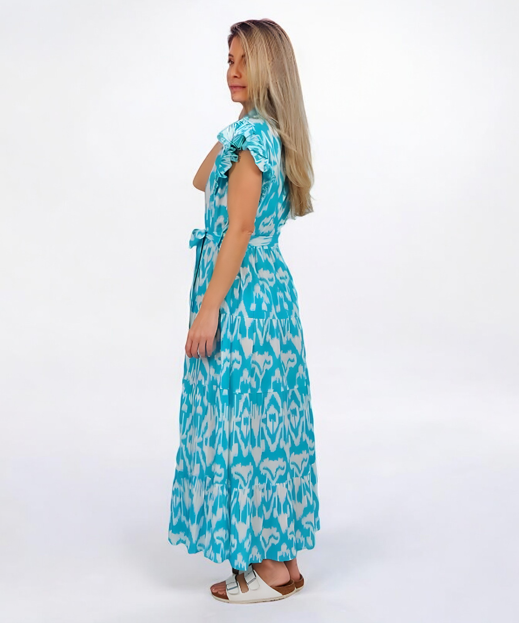 Οι λεπτομέρειες με βολάν στα μανίκια και στο κάτω μέρος προσθέτουν μια ρομαντική και παιχνιδιάρικη πινελιά, καθιστώντας το φόρεμα μοναδικό και ξεχωριστό.