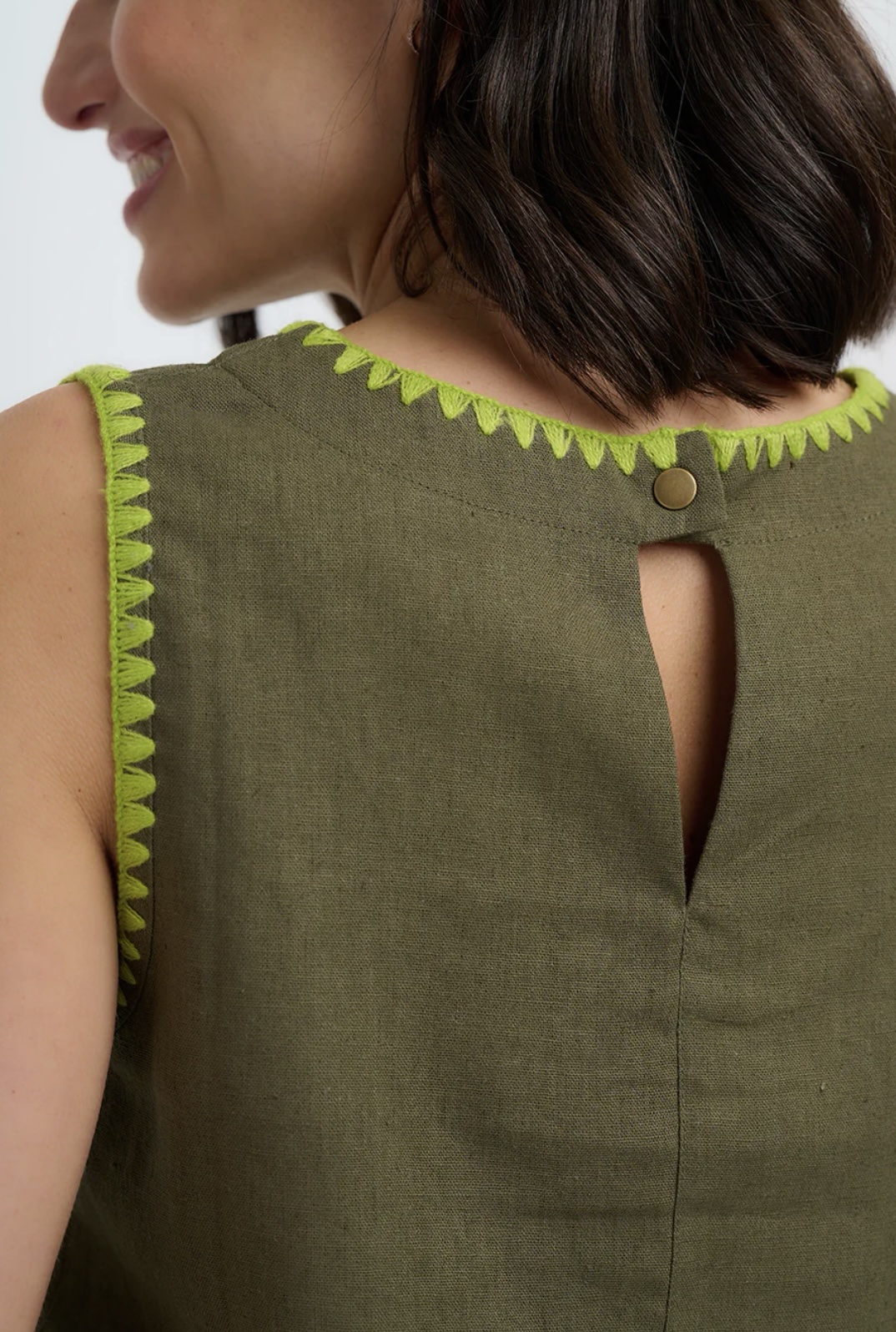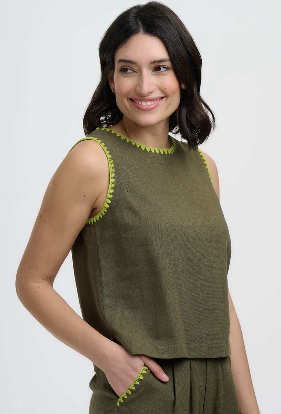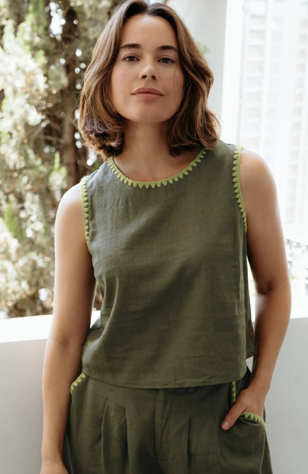 Απλό, κομψό και διακριτικά εντυπωσιακό- το Olive Top είναι ένα μάθημα στο understated στυλ. Σε χαλαρή, boxy γραμμή από υφασμάτινη υφή σε olive green απόχρωση, αυτό το αμάνικο top αναβαθμίζεται από μία μοναδική, προσεγμένη λεπτομέρεια: ένα lime green ζιγκ-ζαγκ κεντημένο τελείωμα που διατρέχει τη λαιμόκοψη και τις μασχάλες, προσθέτοντας μια παιχνιδιάρικη artisan πινελιά σε ένα κατά τα άλλα minimal κομμάτι. Η στρογγυλή λαιμόκοψη και οι καθαρές γραμμές διατηρούν το σχέδιο σύγχρονο και ευέλικτο, ενώ το cropped μήκος το κάνει εύκολο να φορεθεί με πολλούς τρόπους- μέσα από ψηλόμεσα παντελόνια, πάνω από slip dress ή ως co-ord με το αντίστοιχο παντελόνι.