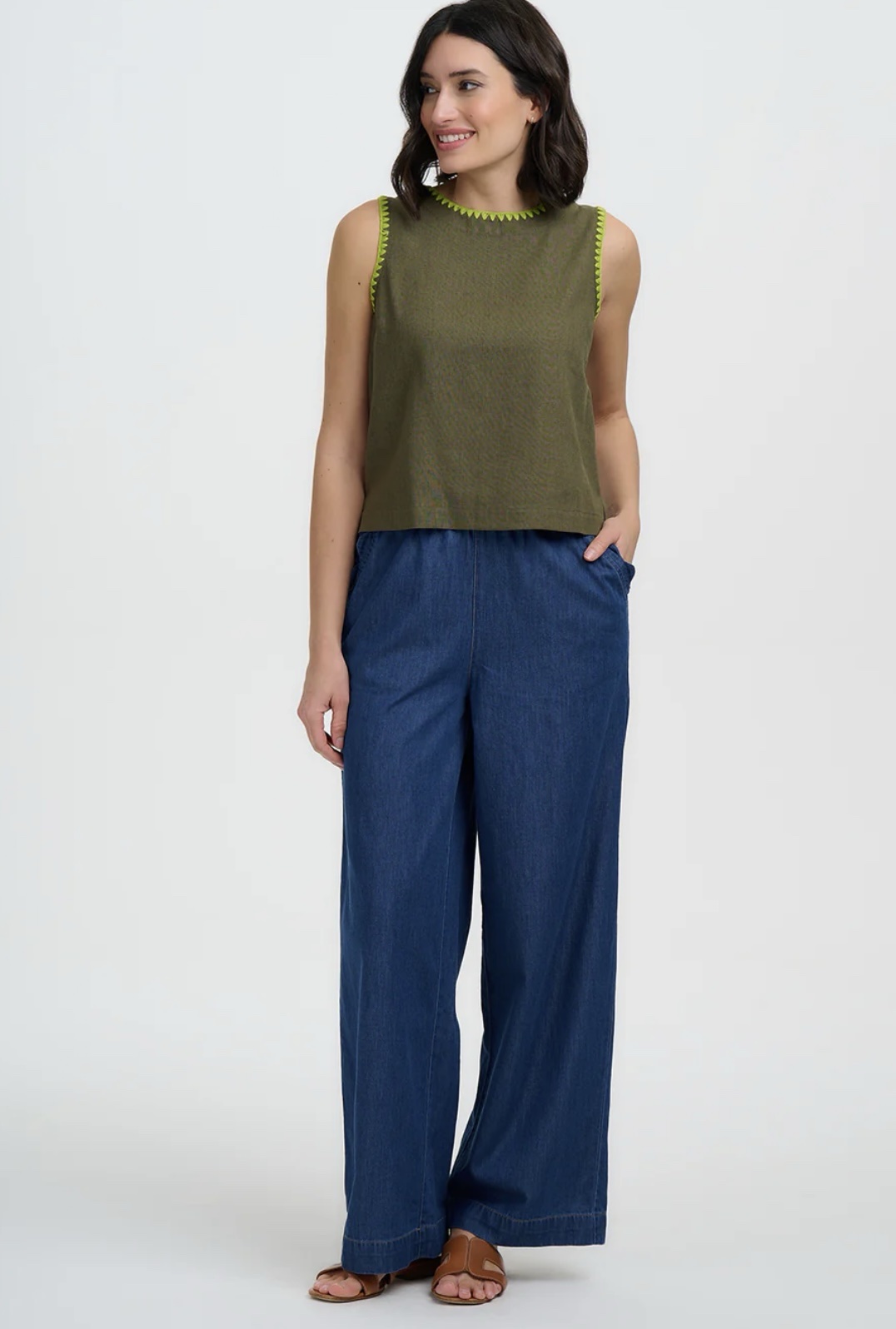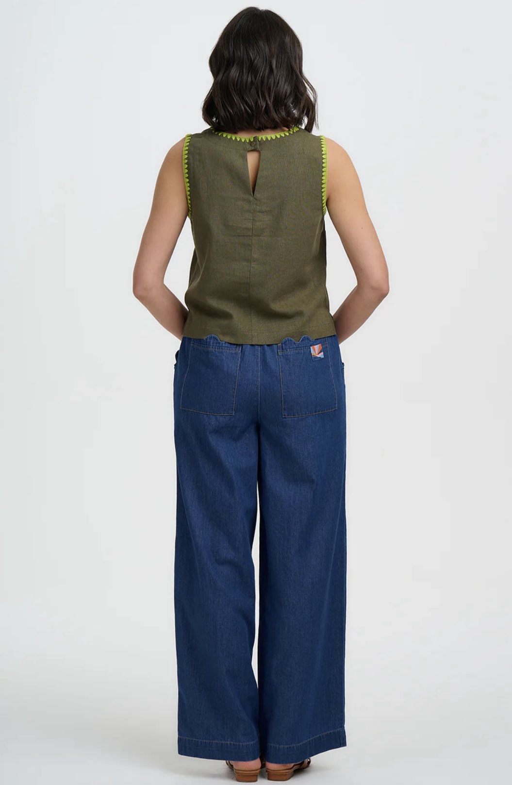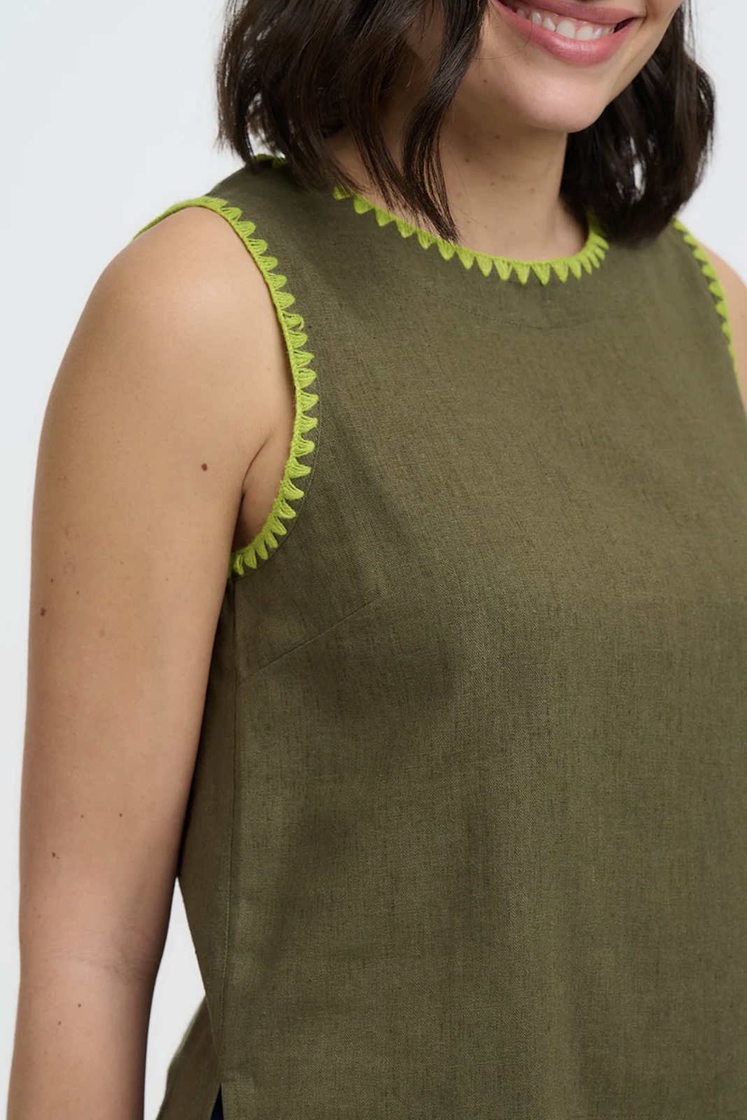 Απλό, κομψό και διακριτικά εντυπωσιακό- το Olive Top είναι ένα μάθημα στο understated στυλ. Σε χαλαρή, boxy γραμμή από υφασμάτινη υφή σε olive green απόχρωση, αυτό το αμάνικο top αναβαθμίζεται από μία μοναδική, προσεγμένη λεπτομέρεια: ένα lime green ζιγκ-ζαγκ κεντημένο τελείωμα που διατρέχει τη λαιμόκοψη και τις μασχάλες, προσθέτοντας μια παιχνιδιάρικη artisan πινελιά σε ένα κατά τα άλλα minimal κομμάτι. Η στρογγυλή λαιμόκοψη και οι καθαρές γραμμές διατηρούν το σχέδιο σύγχρονο και ευέλικτο, ενώ το cropped μήκος το κάνει εύκολο να φορεθεί με πολλούς τρόπους- μέσα από ψηλόμεσα παντελόνια, πάνω από slip dress ή ως co-ord με το αντίστοιχο παντελόνι.