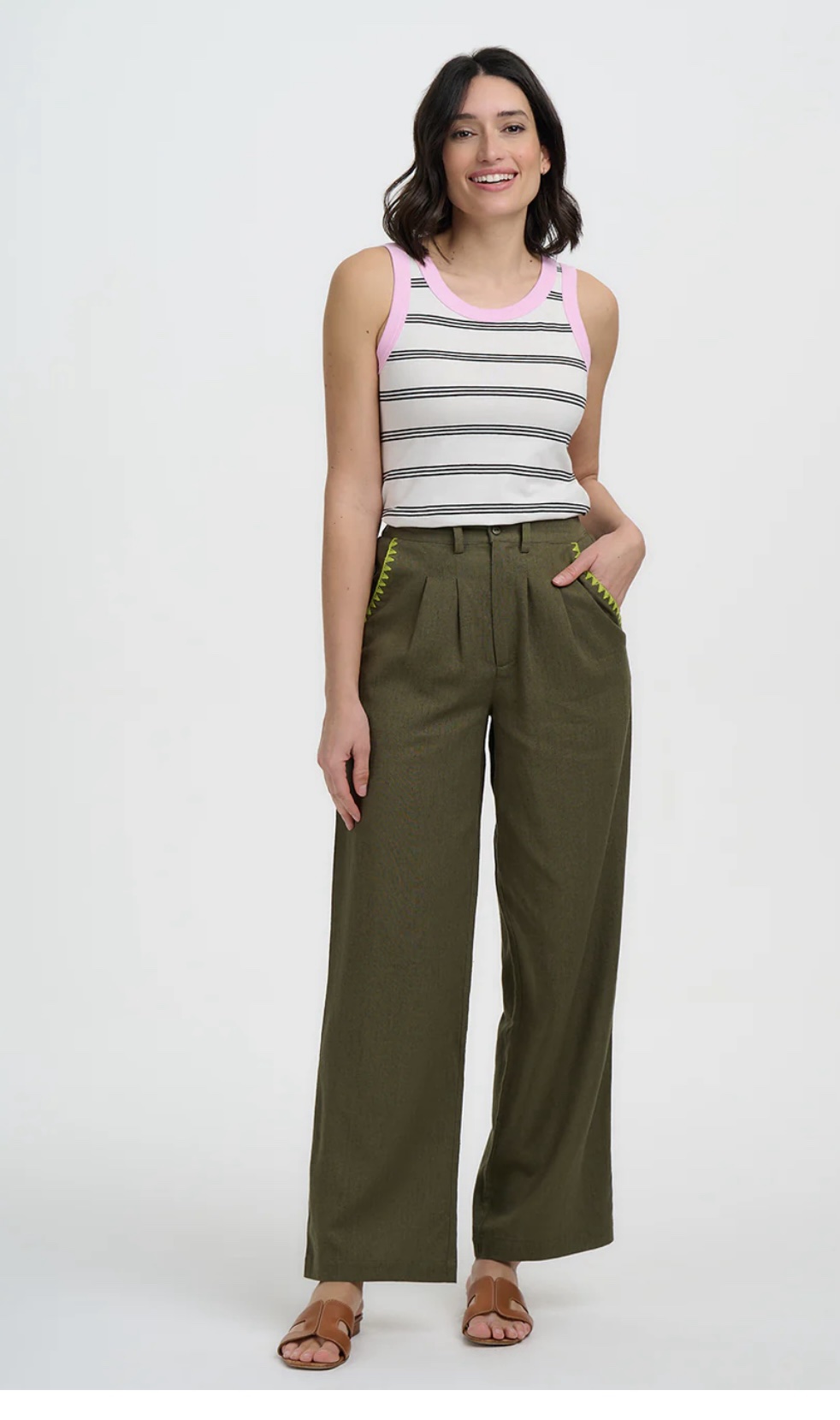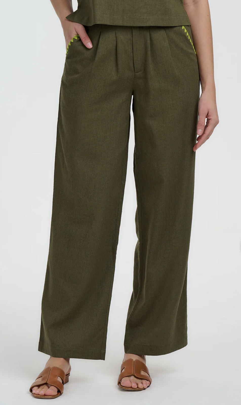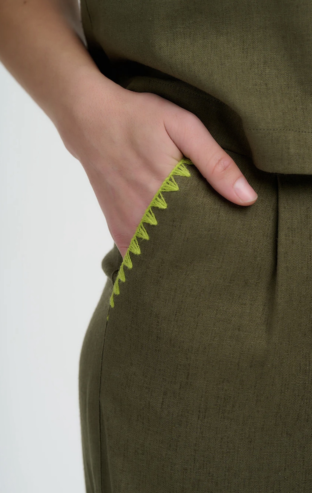 Ψηλόμεσο παντελόνι σε φαρδιά, ίσια γραμμή με διακριτικές πιέτες μπροστά, αυτό το παντελόνι σε olive green απόχρωση ισορροπεί τέλεια ανάμεσα στο χαλαρό και το κομψό- αρκετά προσεγμένο για ένα lunch out, αλλά και άνετο για ένα χαλαρό weekend getaway. Η χαρακτηριστική lime green ζιγκ-ζαγκ κεντημένη λεπτομέρεια του στα ανοίγματα των τσεπών δίνει μια ιδιαίτερη, artisan πινελιά. Οι βαθιές πλαϊνές τσέπες προσθέτουν πρακτικότητα, ενώ η καθαρή, δομημένη μέση χαρίζει ένα ολοκληρωμένο και περιποιημένο αποτέλεσμα.