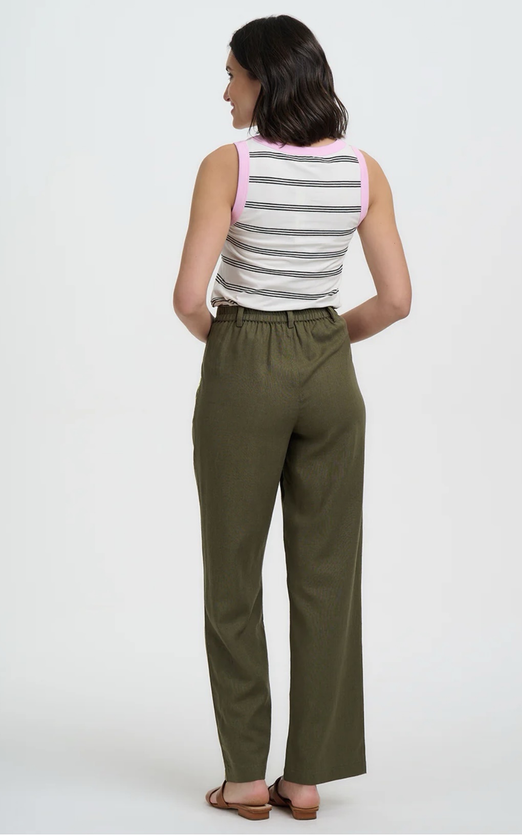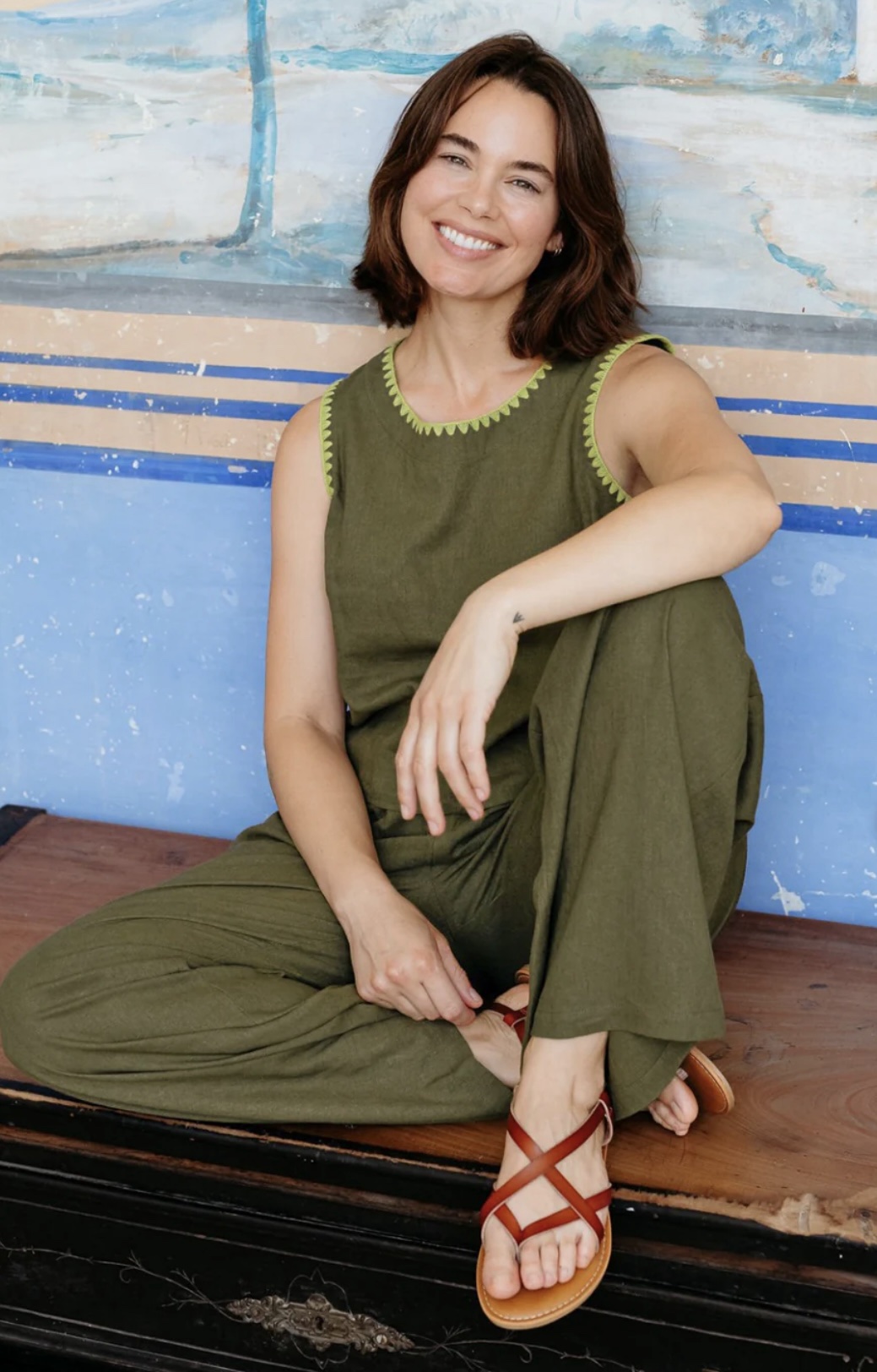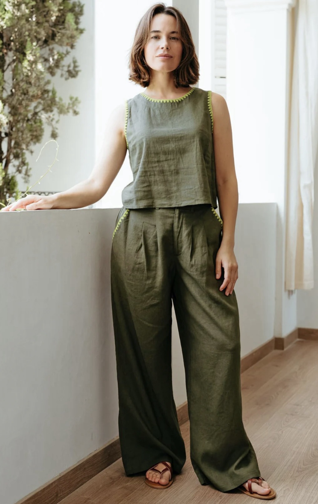 Ψηλόμεσο παντελόνι σε φαρδιά, ίσια γραμμή με διακριτικές πιέτες μπροστά, αυτό το παντελόνι σε olive green απόχρωση ισορροπεί τέλεια ανάμεσα στο χαλαρό και το κομψό- αρκετά προσεγμένο για ένα lunch out, αλλά και άνετο για ένα χαλαρό weekend getaway. Η χαρακτηριστική lime green ζιγκ-ζαγκ κεντημένη λεπτομέρεια του στα ανοίγματα των τσεπών δίνει μια ιδιαίτερη, artisan πινελιά. Οι βαθιές πλαϊνές τσέπες προσθέτουν πρακτικότητα, ενώ η καθαρή, δομημένη μέση χαρίζει ένα ολοκληρωμένο και περιποιημένο αποτέλεσμα.