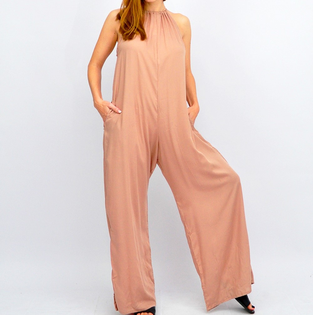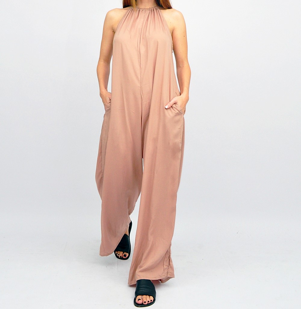 Ολόσωμη φόρμα σε φαρδιά γραμμή. Ιδανική για όλες τις ώρες της μέρας. Δένει στο σβέρκο.