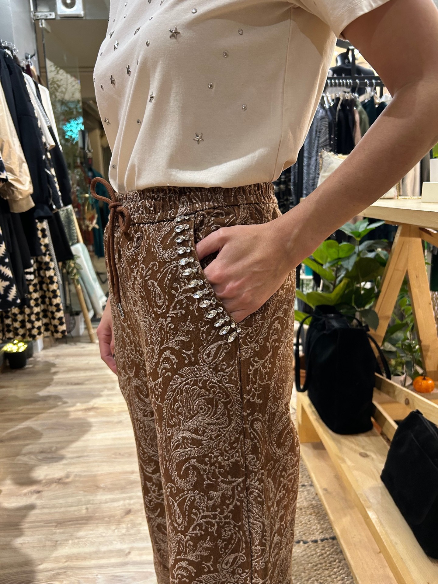 Κομψό ψηλόμεσο παντελόνι με ιδιαίτερες λεπτομέρειες σε στυλ λαχούρι που χαρίζουν ξεχωριστό χαρακτήρα και boho αισθητική. Διαθέτει λάστιχο στη μέση για άνετη εφαρμογή και ευκολία στην κίνηση. Έχει διακοσμημένες τσέπες που προσθέτουν διακριτική λάμψη. Ιδανική επιλογή για καθημερινές αλλά και πιο ιδιαίτερες εμφανίσεις.