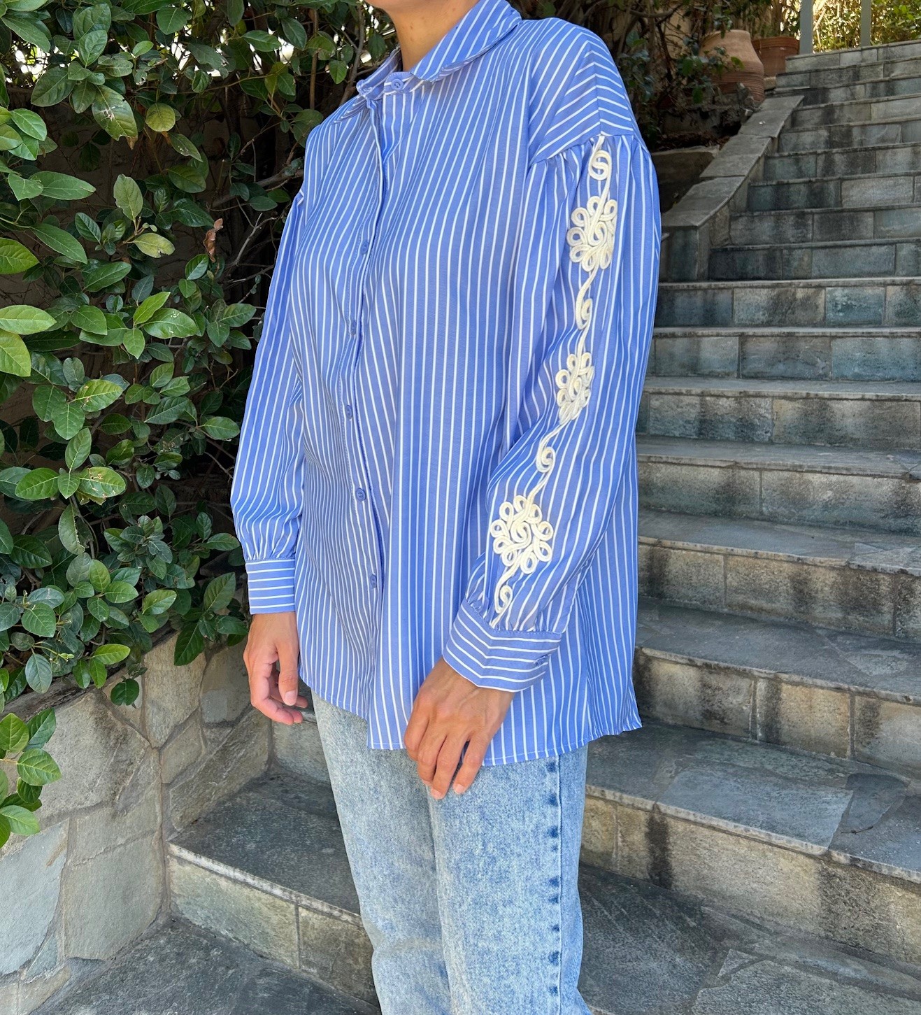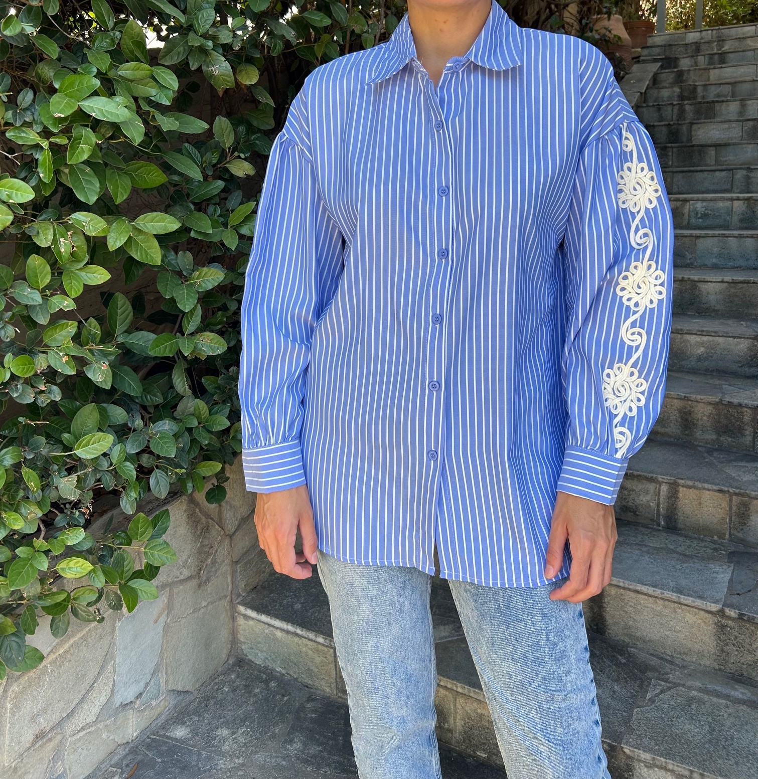 Ριγέ μπλε-λευκό πουκάμισο με κέντημα στα μανίκια