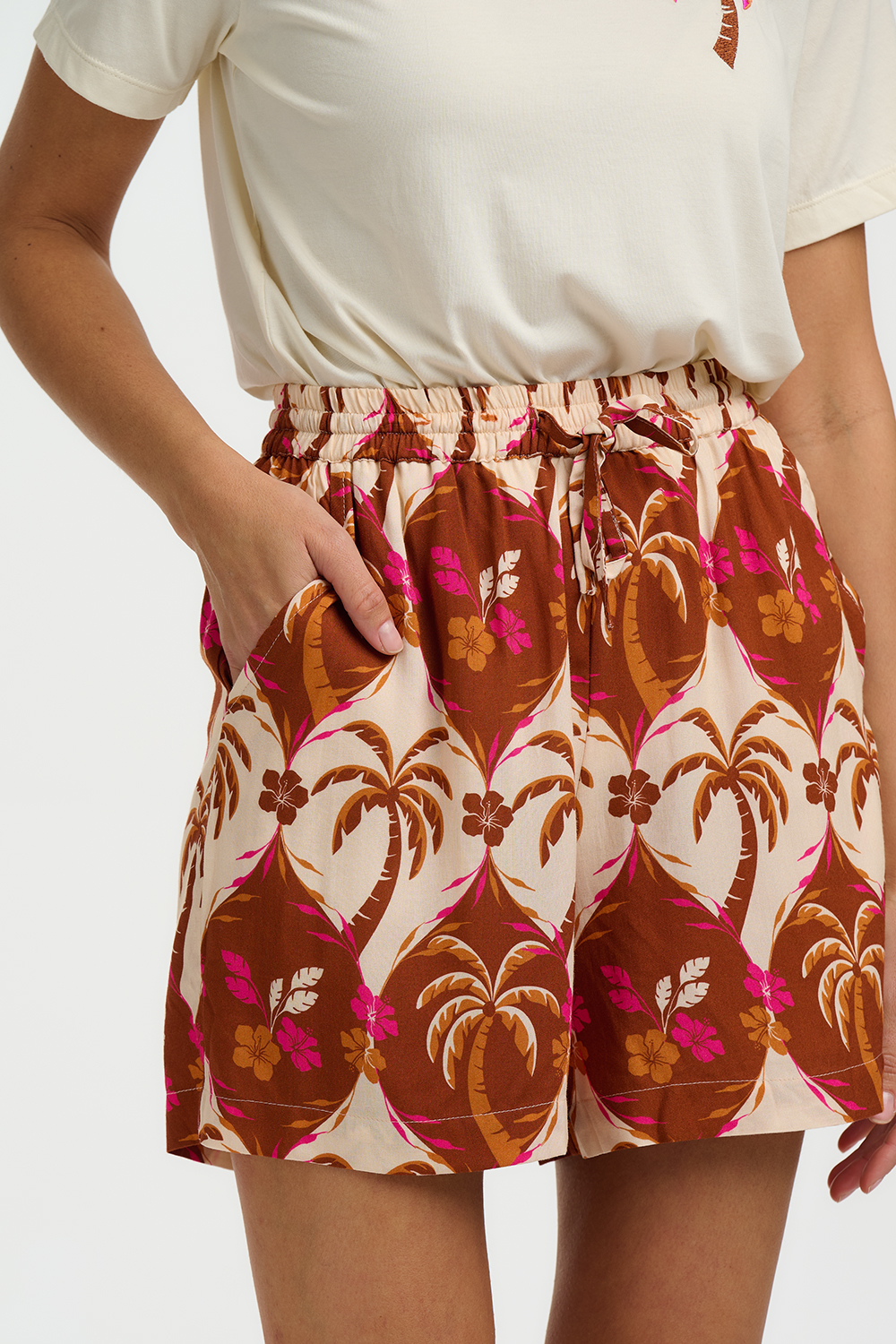 Μείνε δροσερή και στυλάτη όλο το καλοκαίρι με αυτό το σορτς από τη Sugarhill Brighton. Σχεδιασμένο με ελαστική μέση και ρυθμιζόμενο κορδόνι, προσφέρει άνεση και ευελιξία σε κάθε σου εμφάνιση. Ξεχωρίζει με το τροπικό print από φοίνικες και λουλούδια σε ζεστές καφέ αποχρώσεις και έντονα ροζ, δημιουργώντας ένα εντυπωσιακό μοτίβο με vintage έμπνευση. Ο τέλειος συνδυασμός casual άνεσης και statement στυλ.