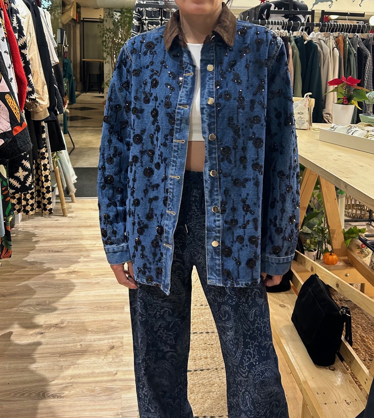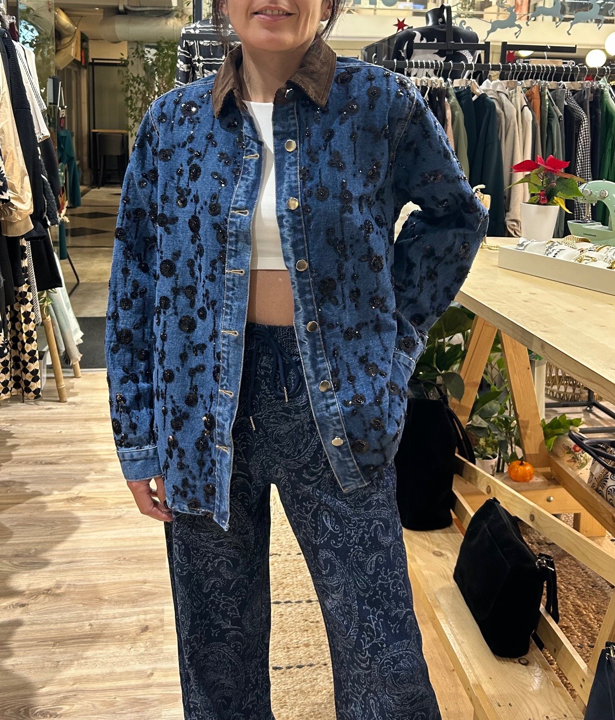 Εντυπωσιακό denim τζάκετ διακοσμημένο με λαμπερές λεπτομέρειες που χαρίζουν μοναδική λάμψη και κομψότητα. Τα διακοσμητικά στοιχεία απογειώνουν το σχέδιο, προσθέτοντας glamorous χαρακτήρα σε κάθε εμφάνιση που αναβαθμίζουν το outfit. Διαθέτει κοτλέ καφέ γιακά που κάνει μια όμορφη αντίθεση και το καθιστά ιδιαίτερο! Φοριέται τόσο σε casual όσο και σε βραδινά looks.