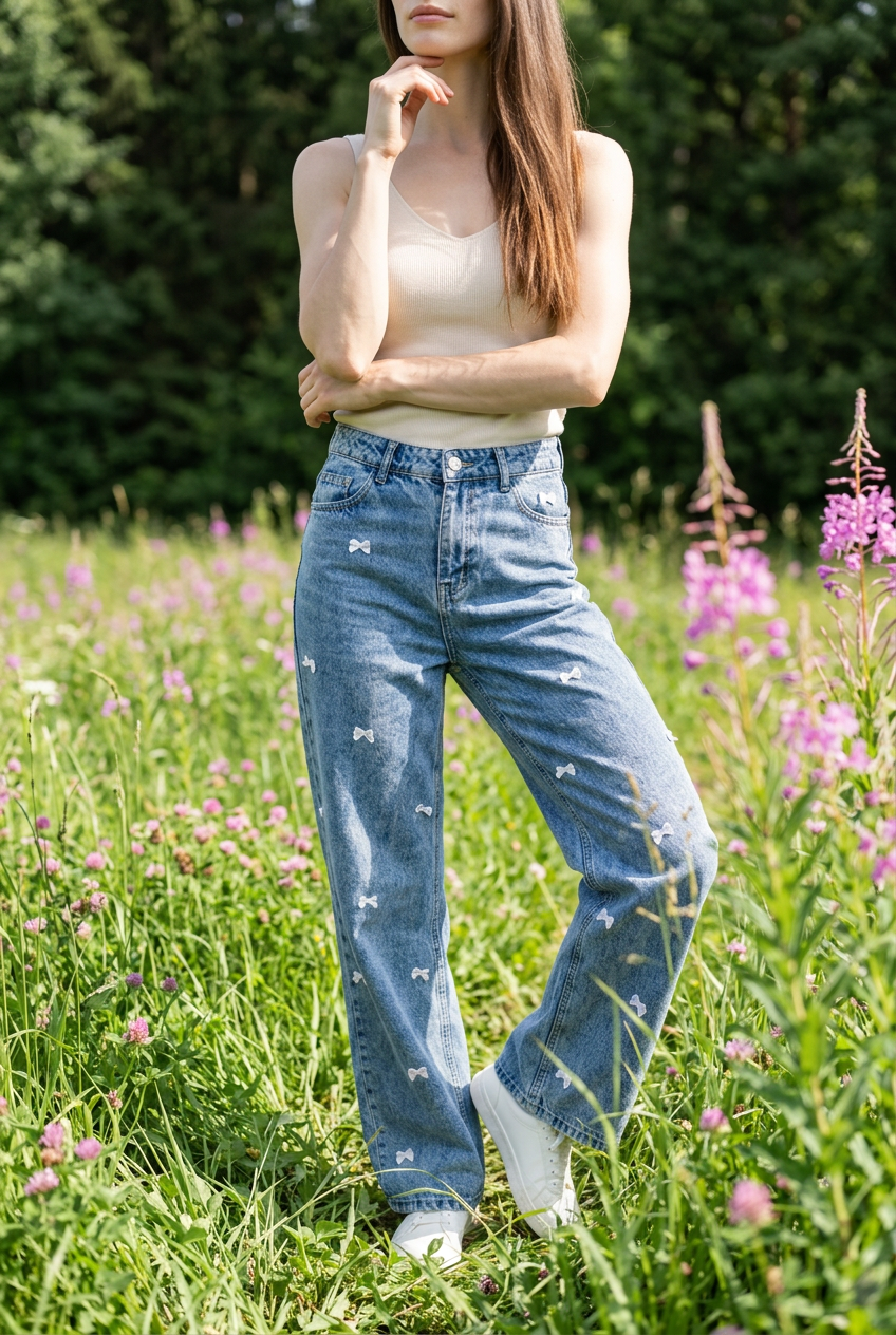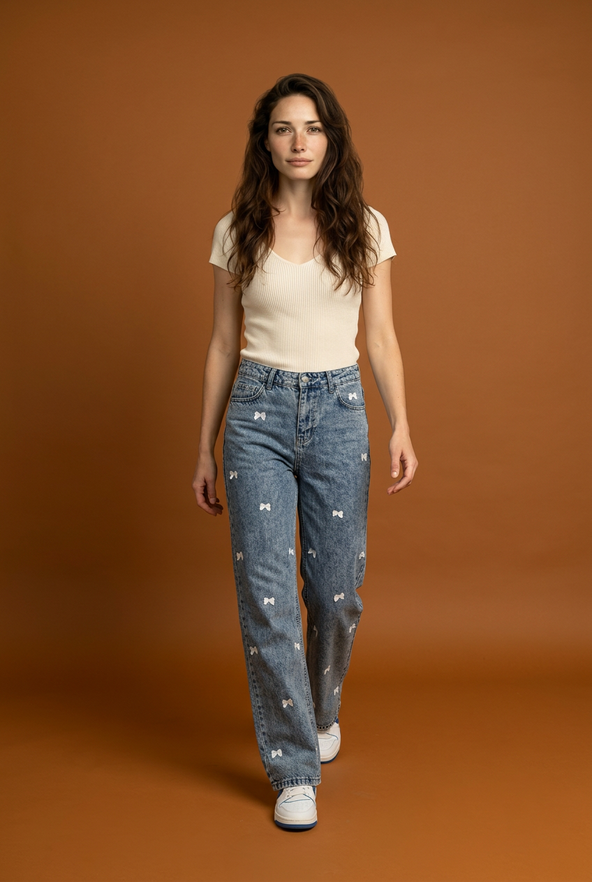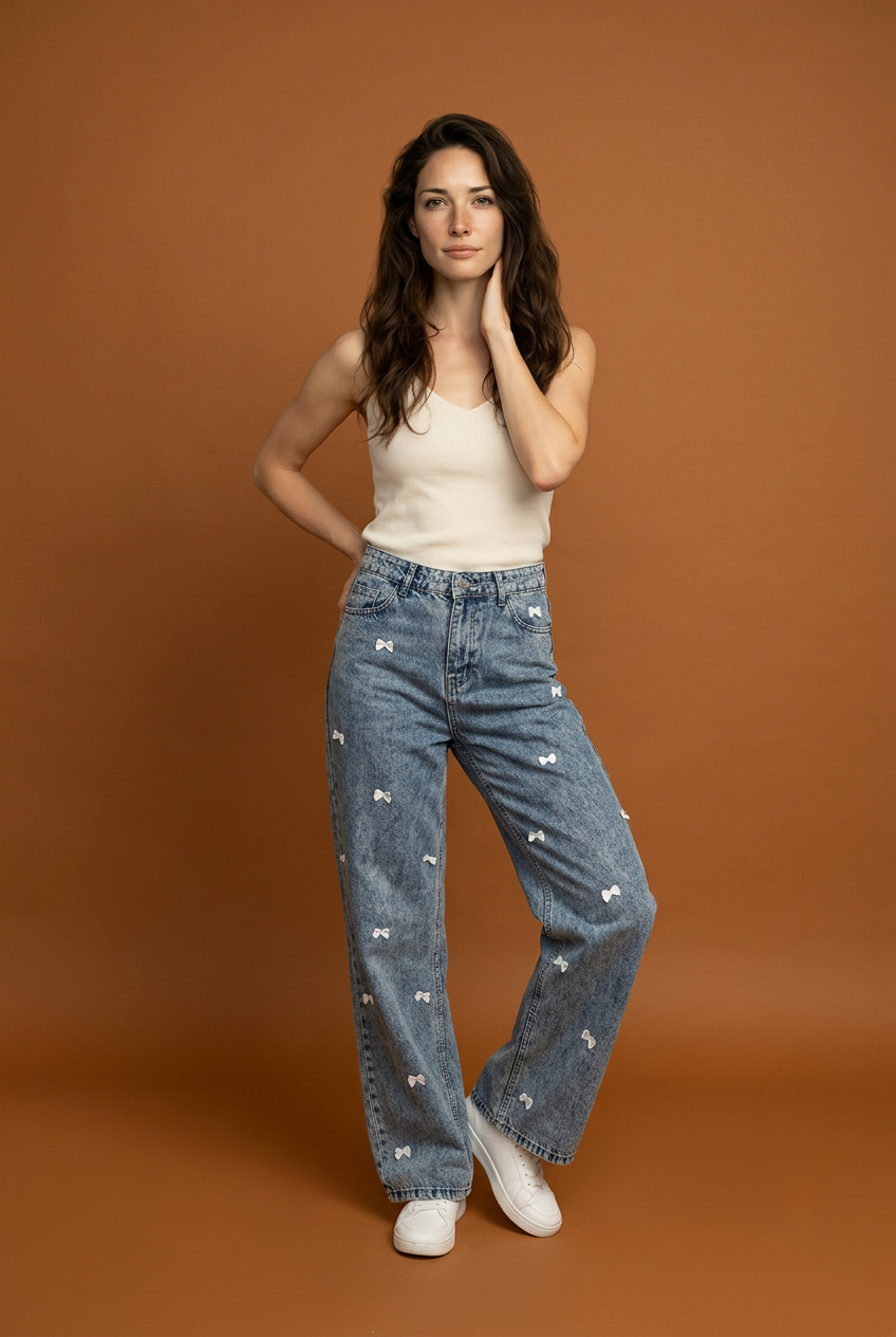 Γυναικείο μπλε τζιν που συνδυάζει το κλασικό denim στυλ με μια ιδιαίτερα πινελιά. Τα ραμμένα φιογκάκια στη μπροστινή πλευρά δίνουν μια κομψή λεπτομέρεια. Η άνετη και ψηλόμεση εφαρμογή το καθιστά ιδανικό για καθημερινά outfits με στυλ. Συνδύασέ το εύκολα με t-shirts, πουκάμισα ή crop tops για μοντέρνες εμφανίσεις όλη την ημέρα.
